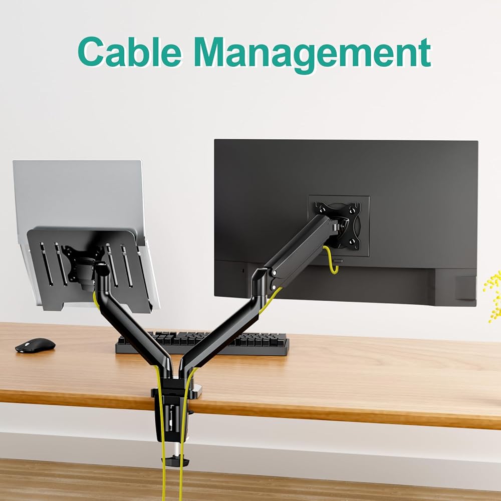 تصميم خاص: يسمح حامل ذراع الكمبيوتر المحمول هذا للمكتب باستخدام الكمبيوتر المحمول والشاشة في نفس الوقت. فتحات التهوية الموجودة في درج الكمبيوتر المحمول يمكن أن تمنع ارتفاع درجة حرارة الكمبيوتر المحمول الخاص بك. يمكن للوسادات الموجودة على علبة الكمبيوتر المحمول تجنب خدوش الكمبيوتر المحمول. يتميز حامل الكمبيوتر المحمول بإدارة متكاملة للكابلات حتى تتمكن من الحفاظ على الأسلاك مرتبة ومنظمة.
