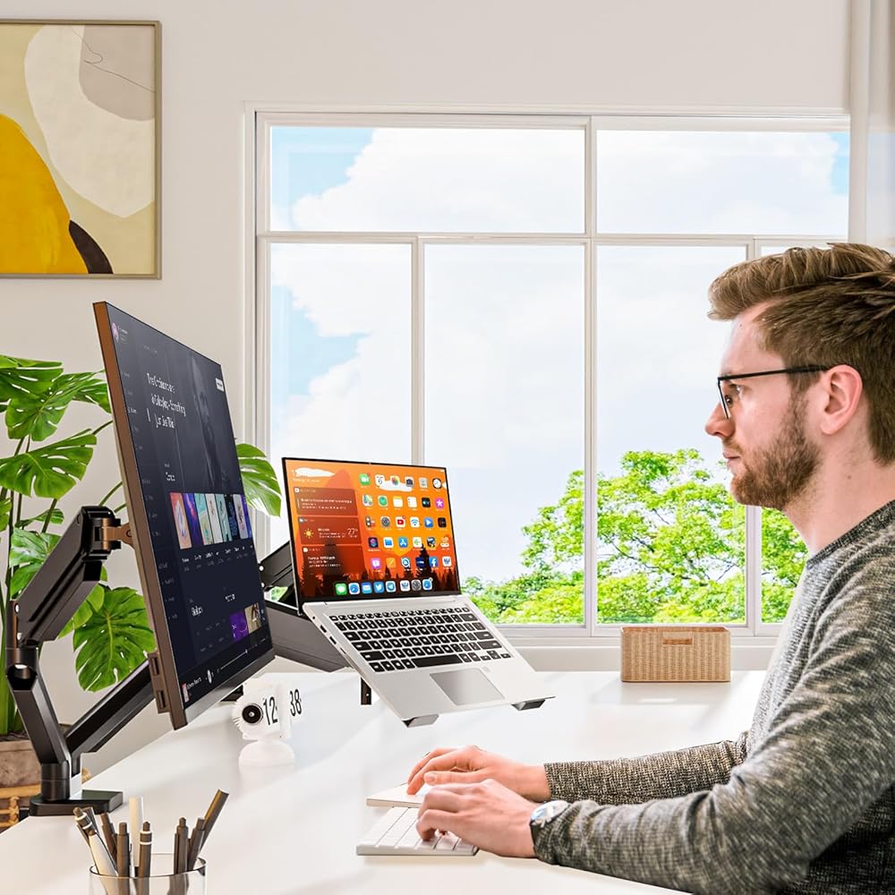 تحسين الكفاءة: يتيح لك حامل شاشة الكمبيوتر المحمول تنظيف سطح المكتب الخاص بك وإنشاء بيئة عمل نظيفة. توفر صينية الكمبيوتر المحمول القابلة للتعديل والمضادة للانزلاق والأذرع المريحة زوايا رؤية مثالية، مما يعزز الكفاءة ويقلل من إجهاد الرقبة.