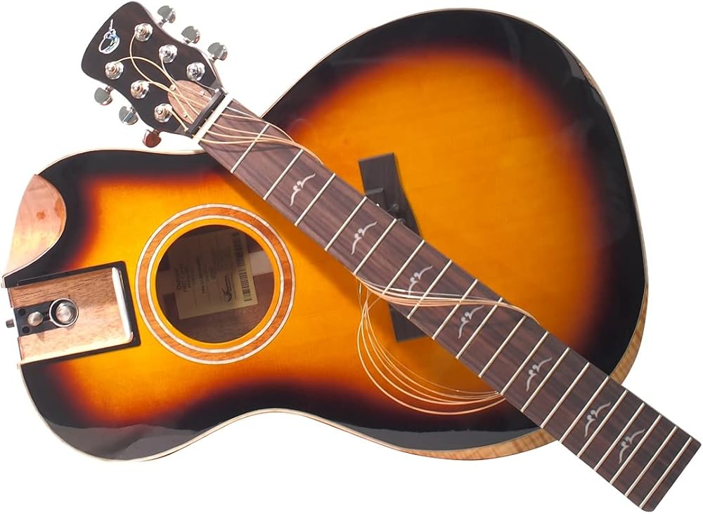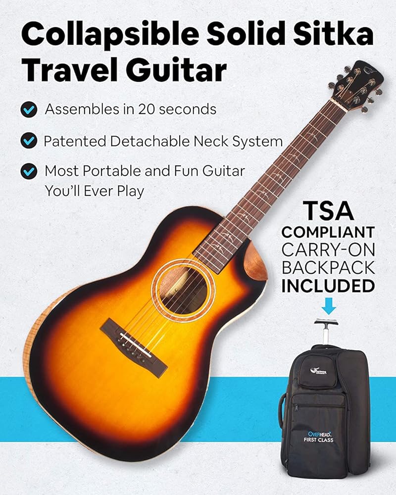 أخيرًا، جيتار كامل الحجم يسهل اصطحابه معك - جيتار صغير قابل للطي للسفر مع نظام رقبة قابل للطي حاصل على براءة اختراع يسمح لك بتجميعه وتفكيكه بسرعة في حوالي 20 ثانية، حتى تتمكن من حمله معك في جميع الأوقات.
