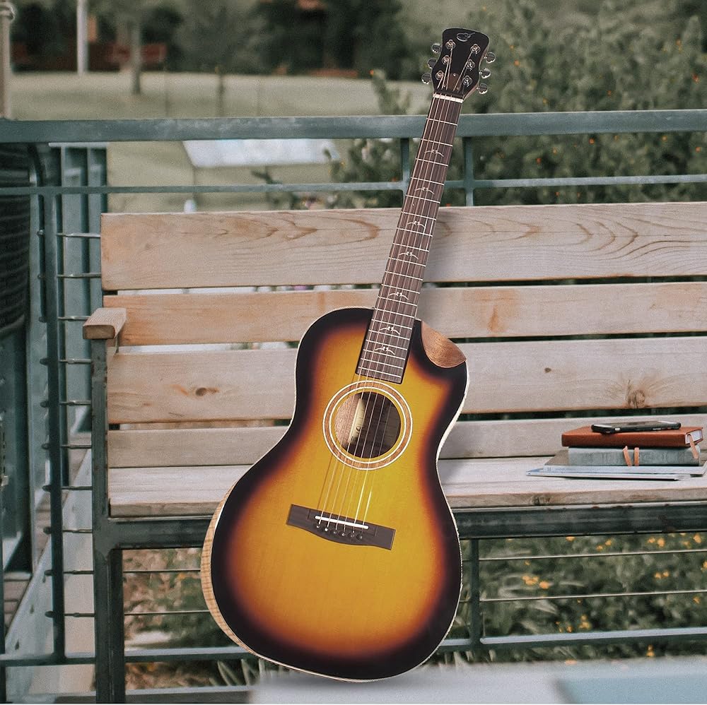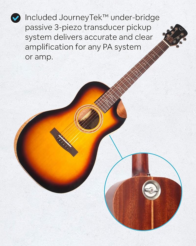 نظام صوتي عالي الجودة لإبهار الجمهور - تتميز فتحة الصوت التقليدية بدعامة X مدببة منقولة للأمام مما يزيد من رنين وحجم لوحة الصوت. سواء كنت تؤدي أداءً لنفسك أو لجمهور صغير أو لحفلة ضخمة، فإن جيتار Journey Instruments الخاص بك جاهز لتقديم أداء ملحمي.