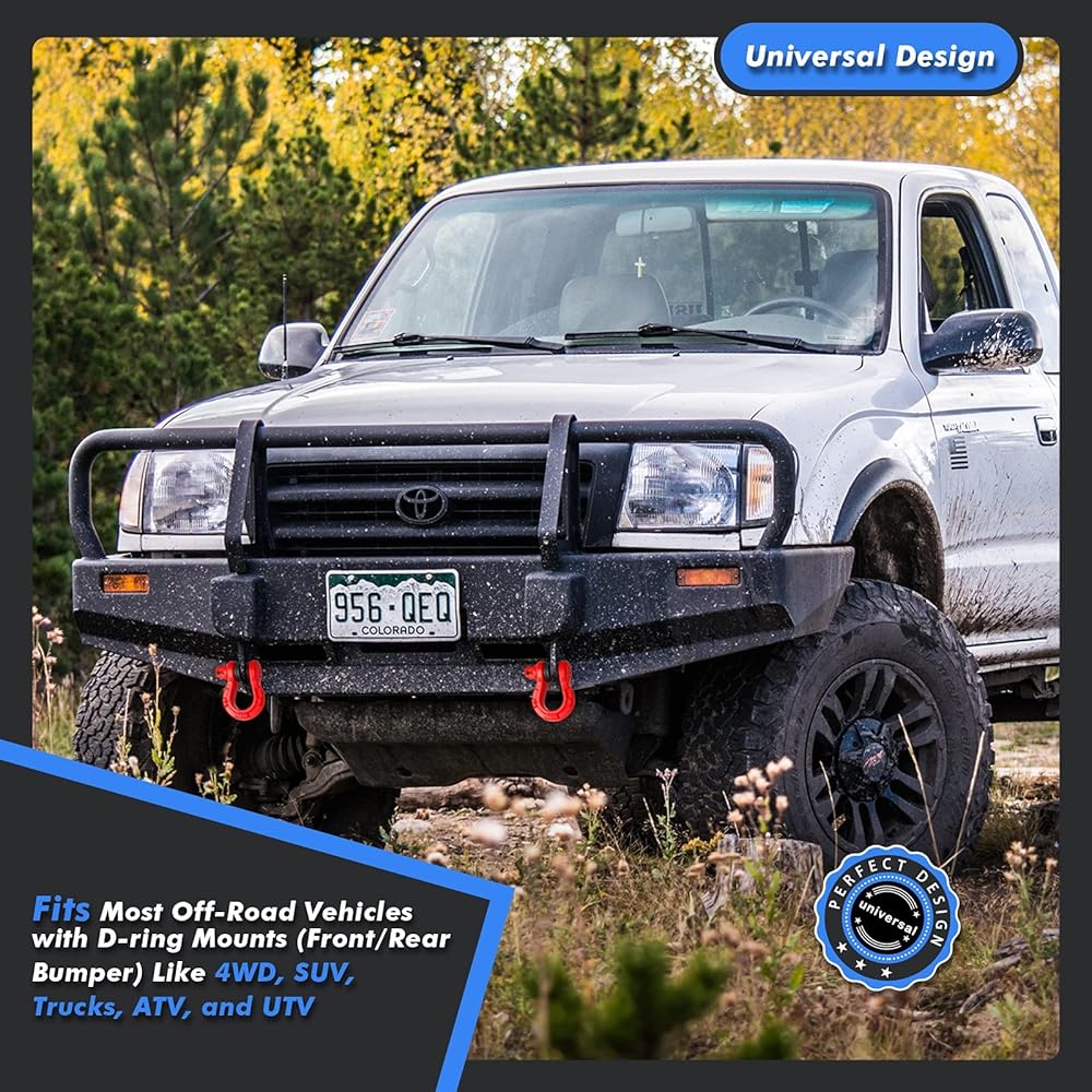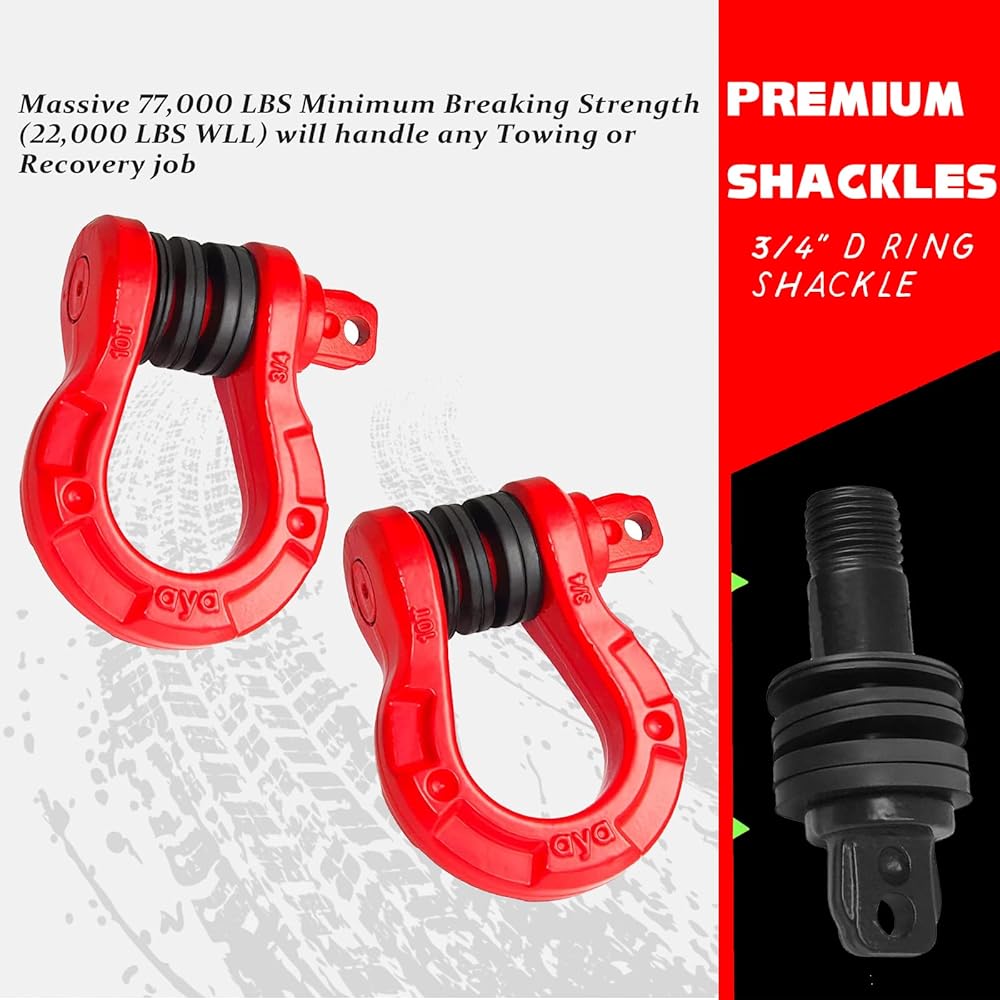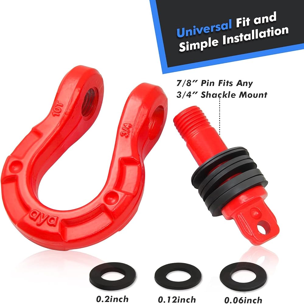 أغلال 3/4 بوصة على شكل حرف D (عبوتان) 77000 رطل (35 طن) قوة كسر مع دبوس لولبي 7/8 بوصة وعازل تكبل ومجموعة غسالات لحزام السحب ونش استعادة المركبات على الطرق الوعرة، أحمر