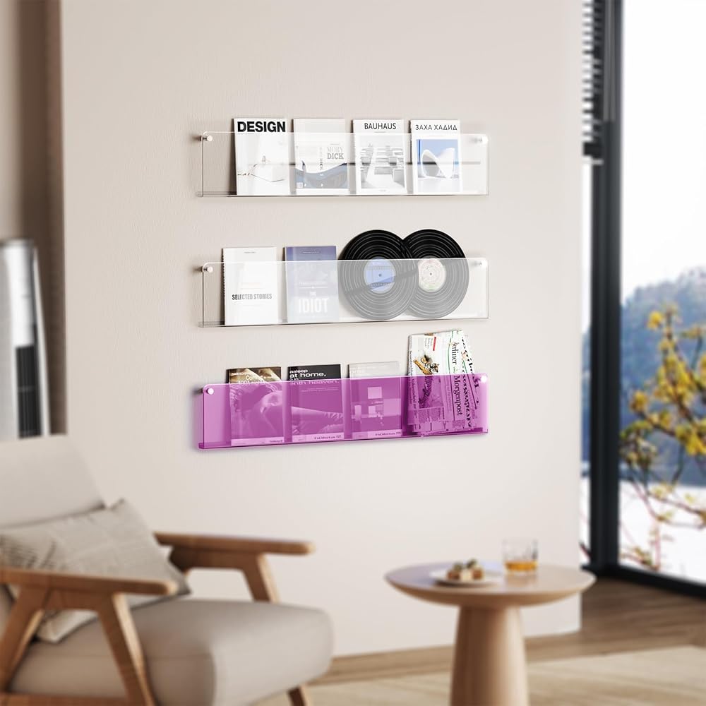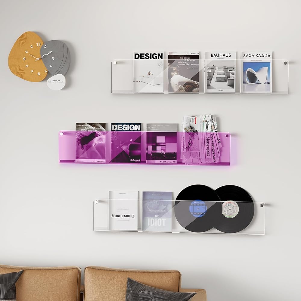 【 مطابقة الألوان الكلاسيكية 】 يتكون رف المجلات المثبت على الحائط من الأكريليك من 2 شفاف و1 أرجواني، مما يضيف اختلافًا أكثر ثراءً في اللون مقارنة بالمنتجات الأخرى ويضيف إحساسًا بالجمال إلى مكتبك أو غرفة معيشتك.