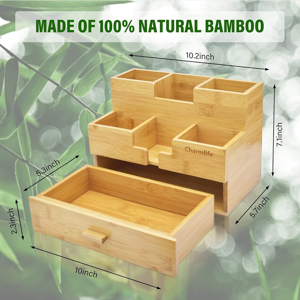 حافظة درج مكتب من الخيزران موفرة للمساحة مناسبة للمكاتب والفصول الدراسية والمنازل. قم بتخزين الأقلام وأقلام الرصاص والهواتف المحمولة والمفاتيح ودفاتر الملاحظات وما إلى ذلك. تستخدم أيضًا لتخزين مستحضرات التجميل والمجوهرات وإكسسوارات الشعر.