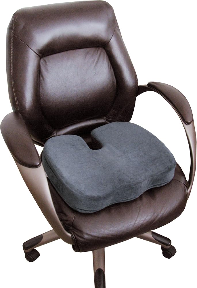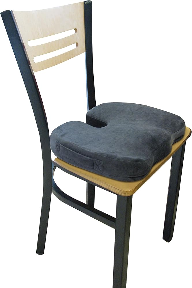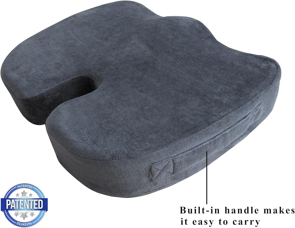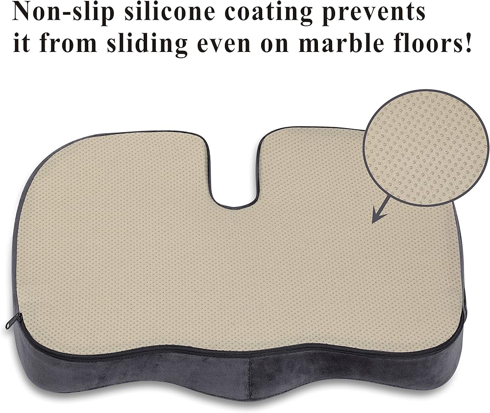 The rear cutout helps to eliminate back pain by reducing pressure on the tailbone. Its ergonomically contoured design profile promotes healthy posture and spine alignment. We've also added a specially designed silicone-coated non-slip cover, so the cushion will stay put on multiple surfaces. The zippered, washable cover can be removed for easy cleaning. Also, the built-in handle makes the cushion easy to transport. The seat cushion measures 18” x 14” x 3” and is backed with a 30-day money-back guarantee.