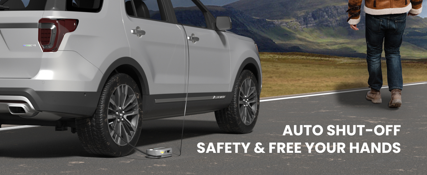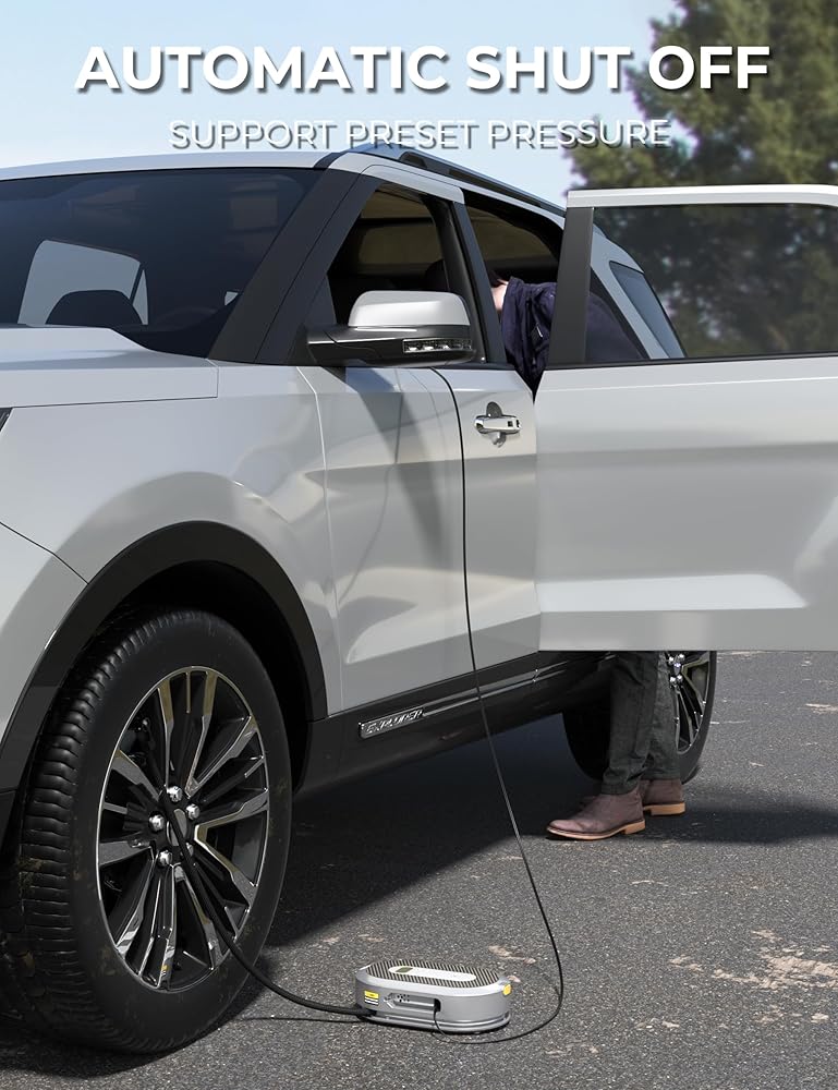 محرك قوي وإضاءة LED - محرك عالي الجودة داخل ضاغط الهواء المحمول لنفخ الإطارات، يمكنه نفخ إطارات سيارتك من 0-35 رطل لكل بوصة مربعة خلال 5 دقائق، ويوفر أقصى ضغط يبلغ 150 رطل لكل بوصة مربعة وتدفق هواء 34 لتر/الدقيقة، مما يعيدك إلى العمل مرة أخرى. الطريق في أي وقت من الأوقات. يسمح ضوء LED للنفخ بالعمل في الليالي المظلمة. 5-10 دقائق من النفخ المستمر، يرجى ترك ضاغط الهواء يرتاح ويبرد لفترة من الوقت.
