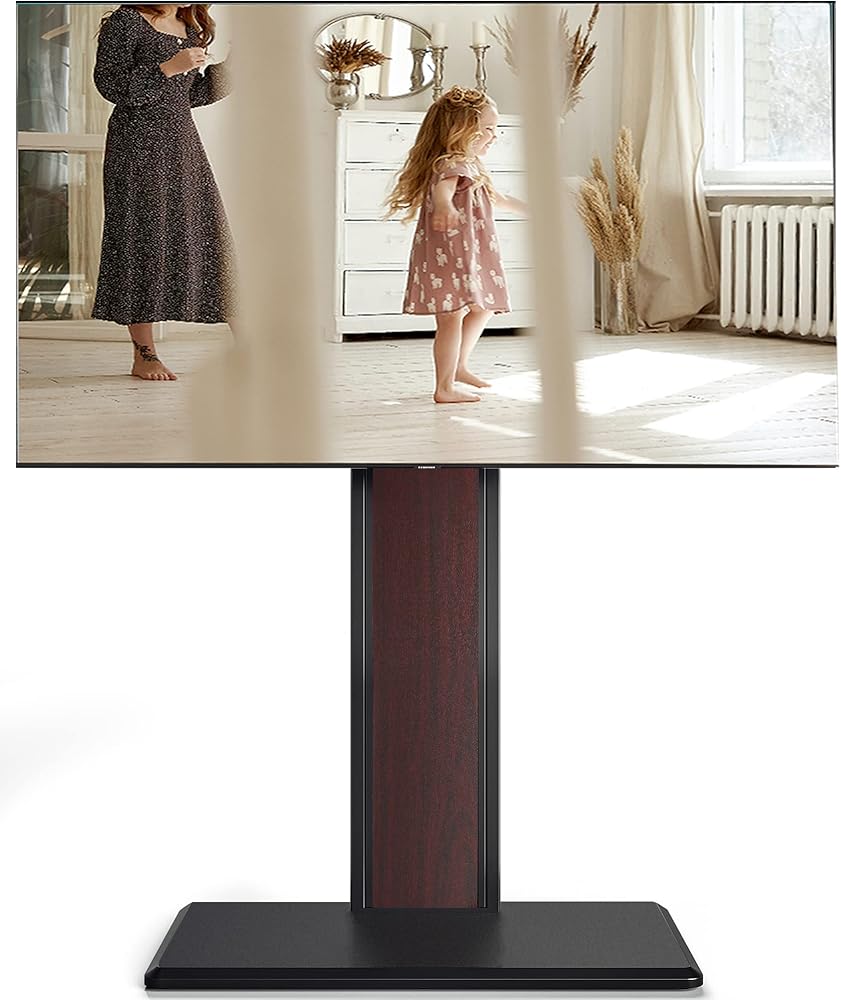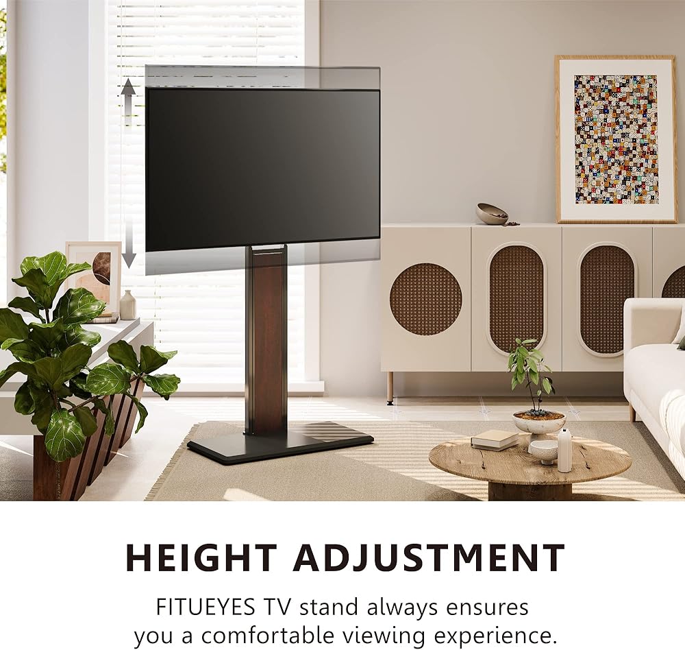 حامل تلفزيون أرضي عالمي من FITUEYES مع حامل دوار قابل للتعديل لـ 32 43 50 55 65 75 بوصة، حامل تلفزيون زاوية حديث في منتصف القرن لتوفير المساحة لغرفة المعيشة وغرفة النوم (أسود وجوز)