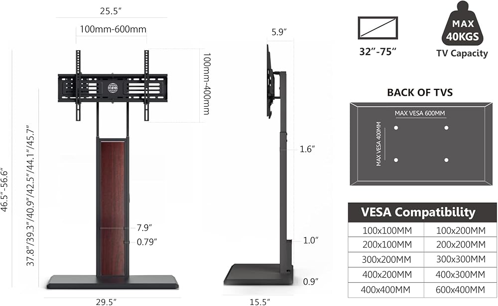 【متوافق مع أجهزة التلفاز مقاس 32-75 بوصة】حامل تلفزيون عالمي من FITUEYES يناسب معظم أجهزة التلفاز ذات الشاشات المسطحة مقاس 32 43 55 60 65 70 75 بوصة. تتراوح أحجام VESA الخاصة بالتلفزيون بين 100 × 100 مم إلى 600 × 400 مم. قاعدة خشبية كبيرة (19.5 بوصة × 15.5 بوصة) وحامل معدني قوي يتحمل ما يصل إلى 40 كجم/88 رطلاً. تأكد من أن تلفزيونك يناسب هاتين الميزتين، وسيكون حامل التلفزيون المزود بحامل مناسبًا لجهاز التلفزيون الخاص بك.