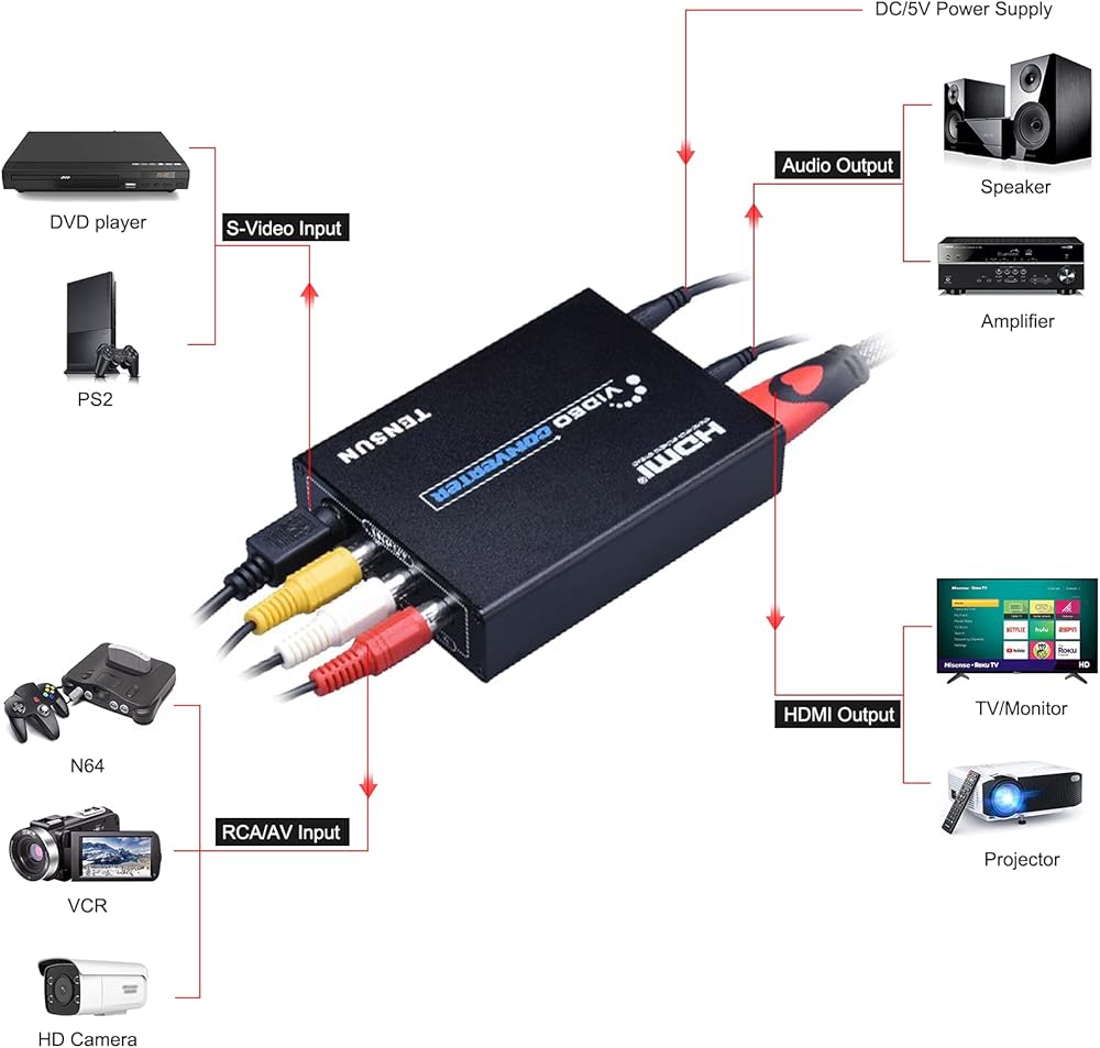 محول 3RCA AV CVBS مركب وS-Video R/L صوت إلى HDMI يدعم 720P/1080P لجهاز PS2 PS3 NES SNES نينتندو 64 HDTV، TEN-HD069