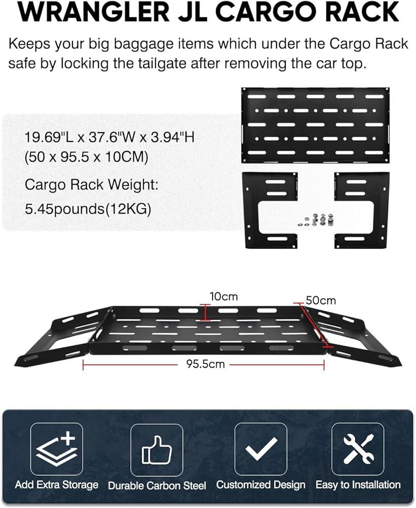 【مادة متينة】: مصنوعة من صفائح فولاذية مقاس 14 (5/64 بوصة) وقياس 11 (1/8 بوصة). وزن حامل Wrangler JL Cargo: حوالي 37 رطلاً. لمسة نهائية متينة من مسحوق أسود لمتانة طويلة الأمد ومقاومة للتآكل.