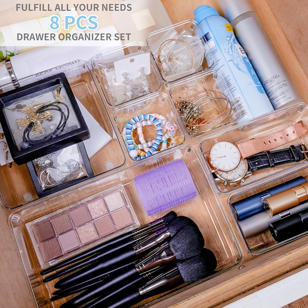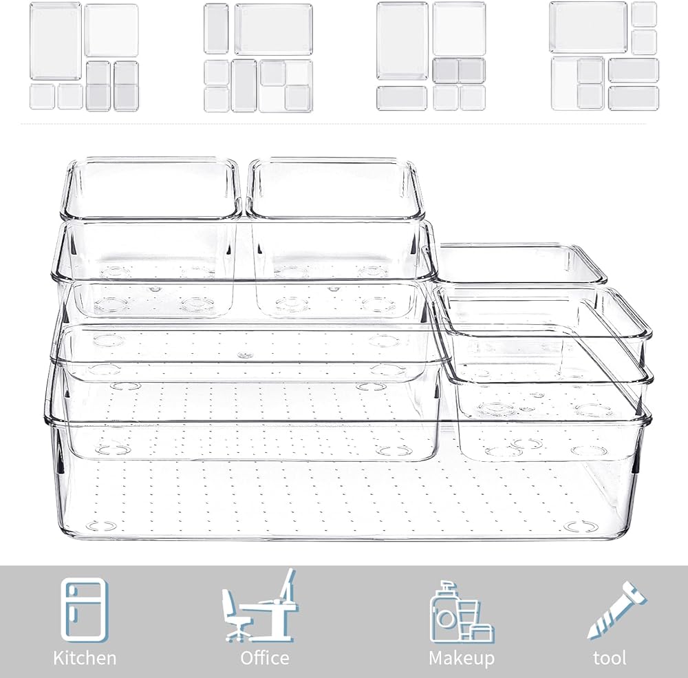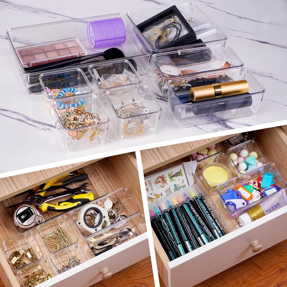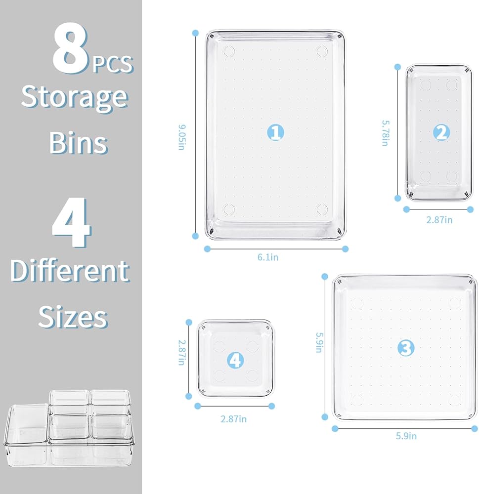 تأتي الصناديق الثمانية بأربعة أحجام مختلفة لاستيعاب العديد من العناصر المختلفة، ويمكن استخدامها في خزانة الملابس والمكتب والمطبخ والحمام. مثالية لتخزين مستحضرات التجميل وأدوات المكياج ومستحضرات التجميل واللوازم المكتبية وأدوات المطبخ والمجوهرات والمزيد.