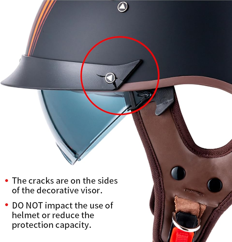 【ملاحظة: بالإضافة إلى اللون الأسود غير اللامع، قد تكون هناك تشققات في حافة خوذات نصف الوجه بالألوان الأربعة الملاك/ الأبيض اللامع/ تاج الرؤساء/ الهندي. لا تؤثر الشقوق الموجودة على جانبي القمة على وظيفة خوذات الدراجات النارية أو قدرتها على الحماية. إذا كانت التفاصيل تقلقك، فيرجى عدم شرائه.