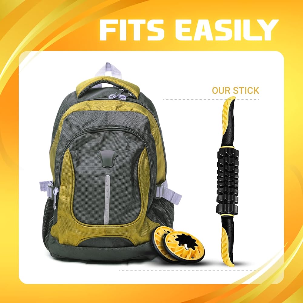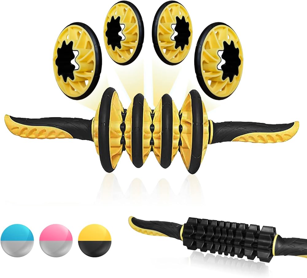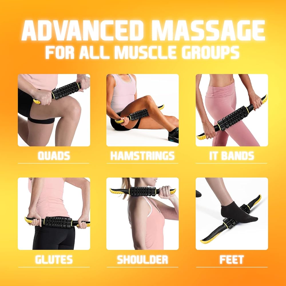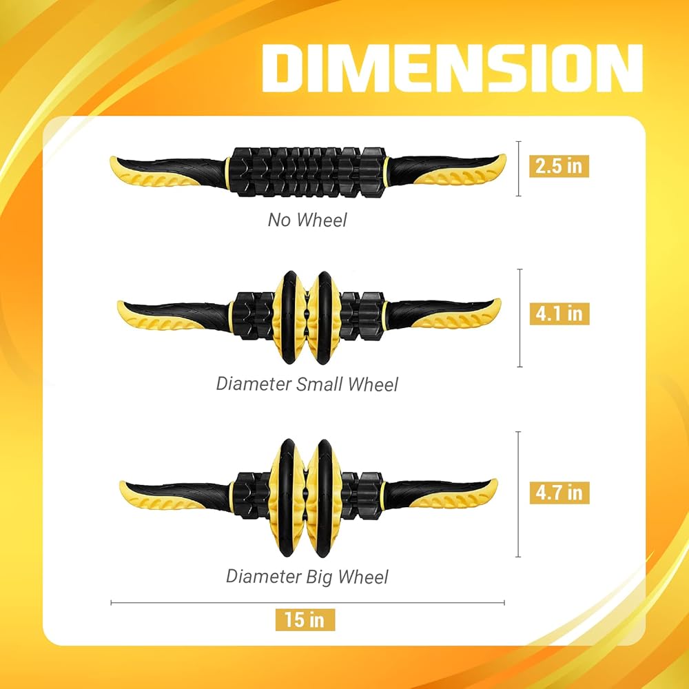 متقدمة بـ 4 عجلات لتدليك الأنسجة العميقة للعضلات: عجلتان ضيقتان في المنتصف لإطلاق نقاط الزناد عند الساق والساعدين والعضلة ثلاثية الرؤوس والعضلة ذات الرأسين. عجلتان أوسع لزيادة تدفق الدم والتعافي السريع لمجموعات العضلات الكبيرة مثل السيقان والعمود الفقري والرقبة وأوتار الركبة والظهر