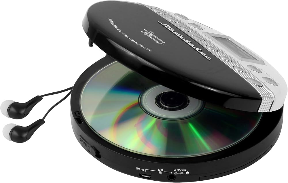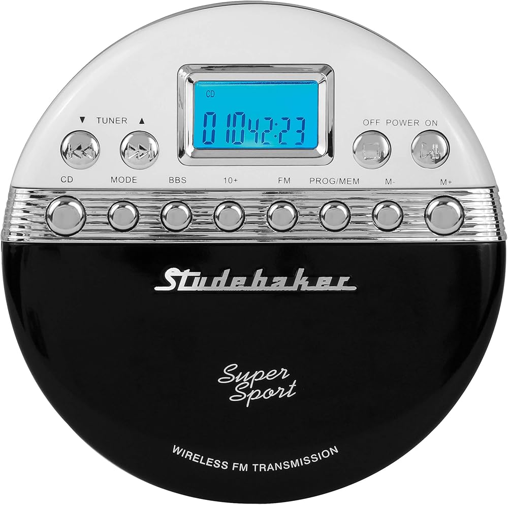 مشغل الأقراص المضغوطة المحمول Studebaker SB3705BW Super Sport يقوم بتشغيل الأقراص المضغوطة لاسلكيًا من خلال راديو السيارة ويتضمن راديو ستيريو FM وسماعات أذن استريو متناسقة الألوان