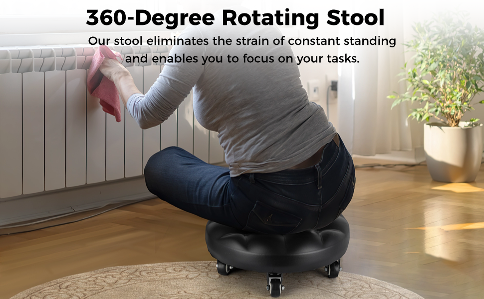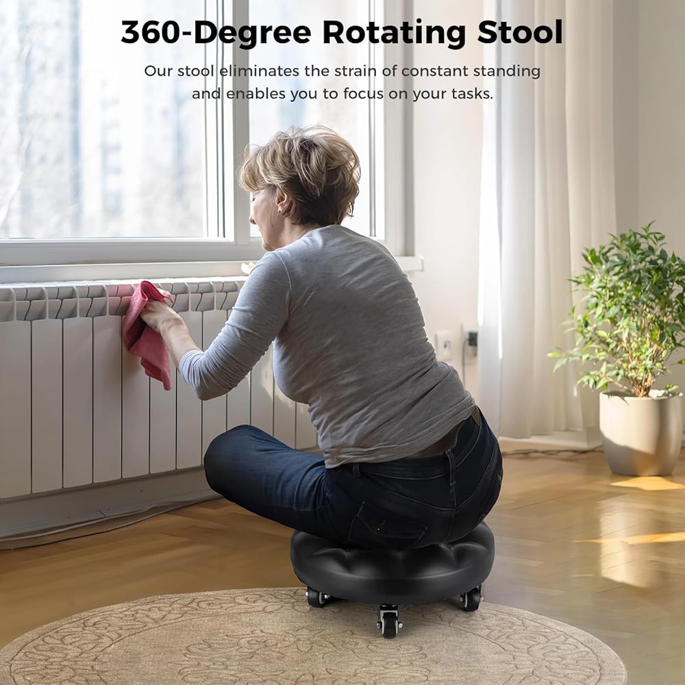 【تنقل بدون جهد مع 5 عجلات عالمية】مجهز بـ 5 عجلات عالمية، يوفر المقعد الدوار الخاص بنا حركة سهلة في أي اتجاه. يمكنك الجلوس بشكل مريح على المقعد والانزلاق مع العجلات. إنها أداة مثالية للمهام التي تتطلب حركات متكررة، مما يجعل عملك أكثر كفاءة وراحة