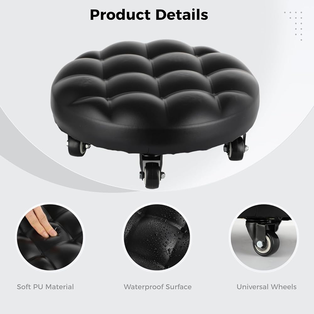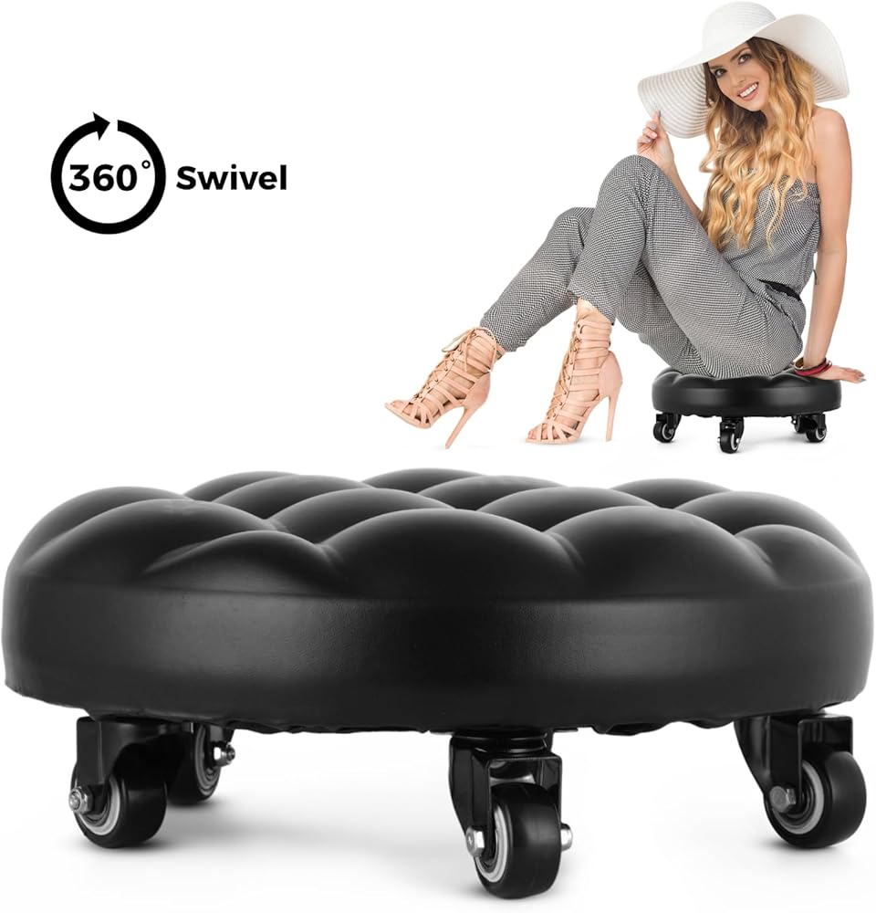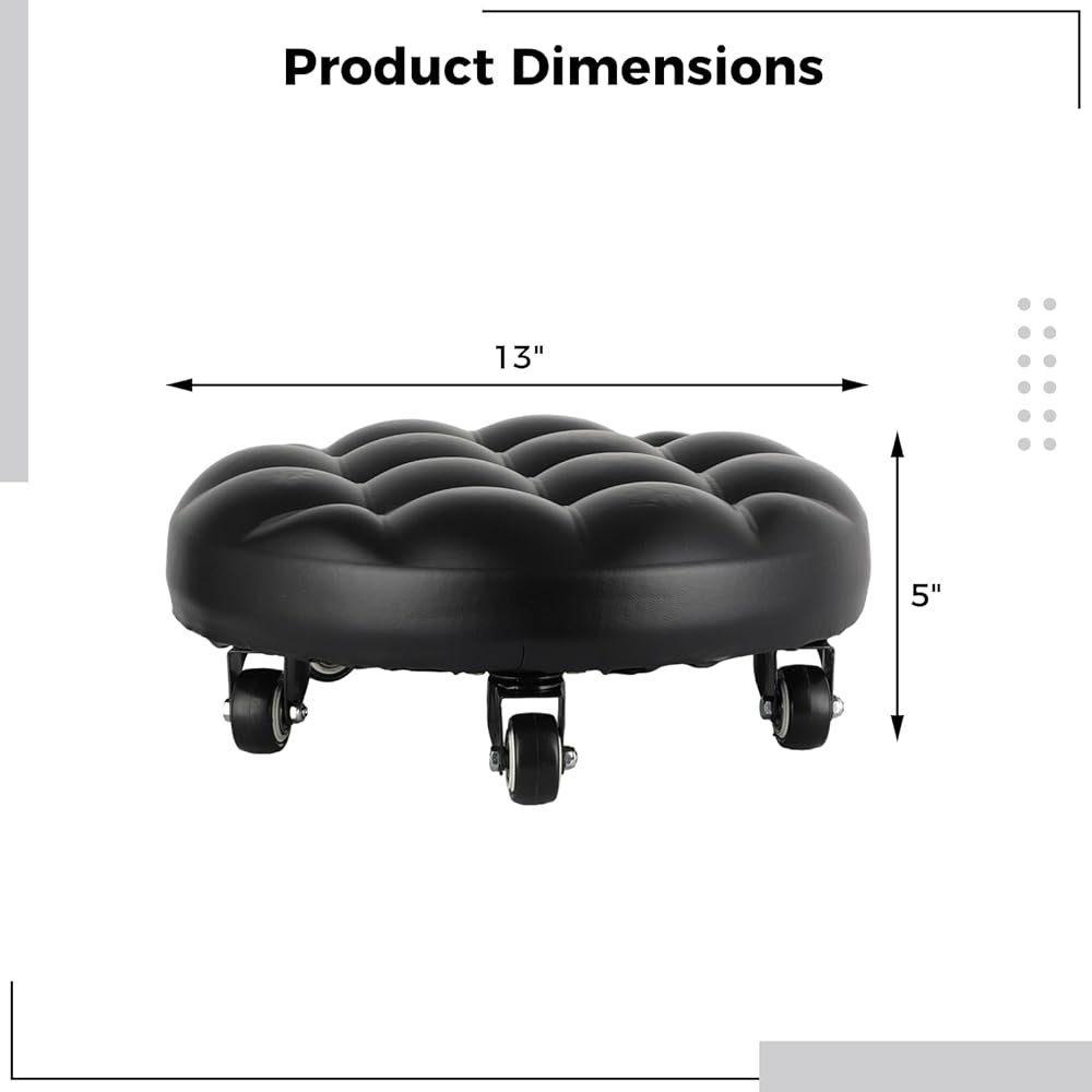 مقعد دوار منخفض إلى الأرض مع 5 عجلات دوارة عالمية للمنزل والمكتب أو اللياقة البدنية أو متجر المرآب وسادة من جلد البولي يوريثان عالية الكثافة والفولاذ الأسود المصنفر