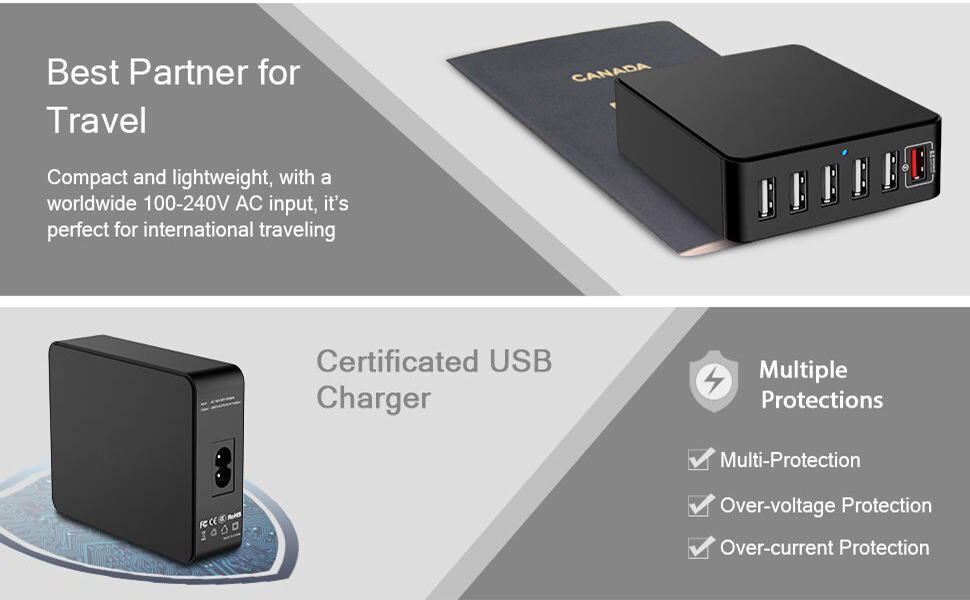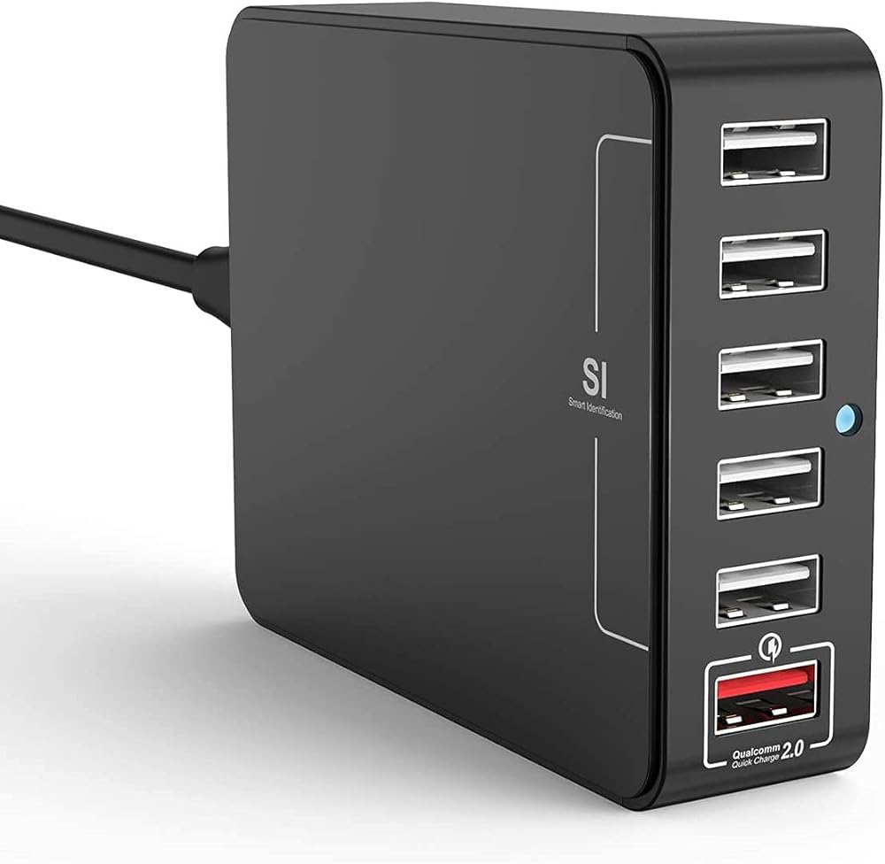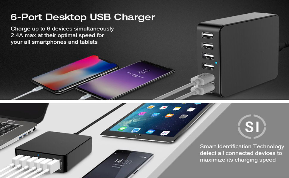 【التوصيل والذكاء الفائق】شاحن USB الكل في واحد بـ 6 منافذ. قم بتوصيل وشحن جميع الأجهزة التي تعمل بمنفذ USB باستخدام محطة شحن واحدة. يمكن لتقنية SI الحصرية التعرف على أجهزتك بذكاء وزيادة سرعة الشحن.