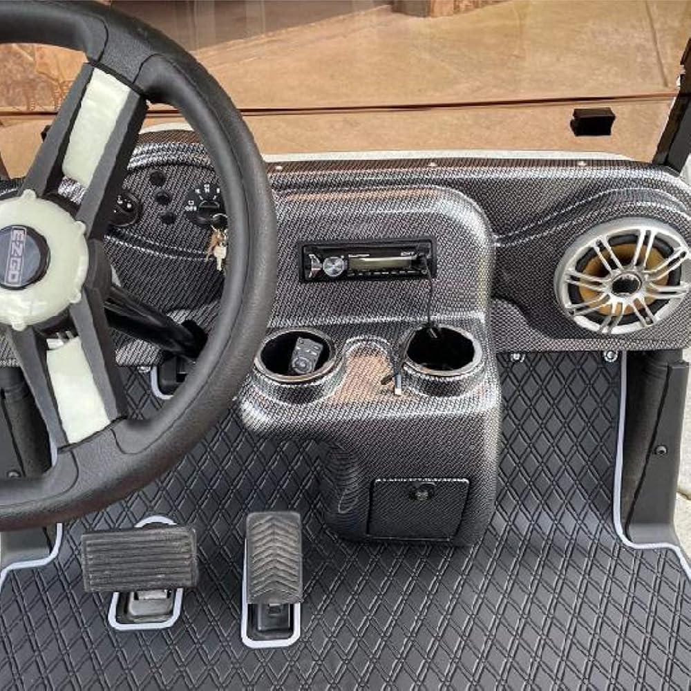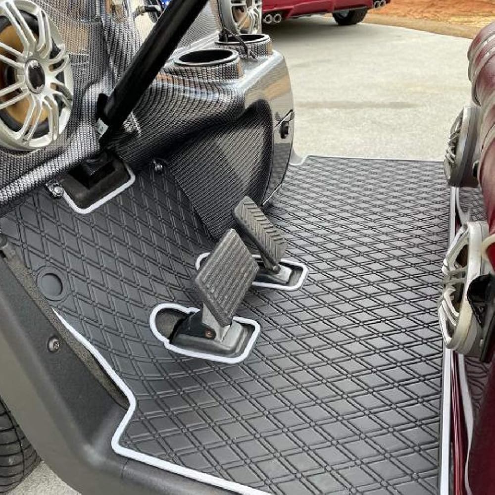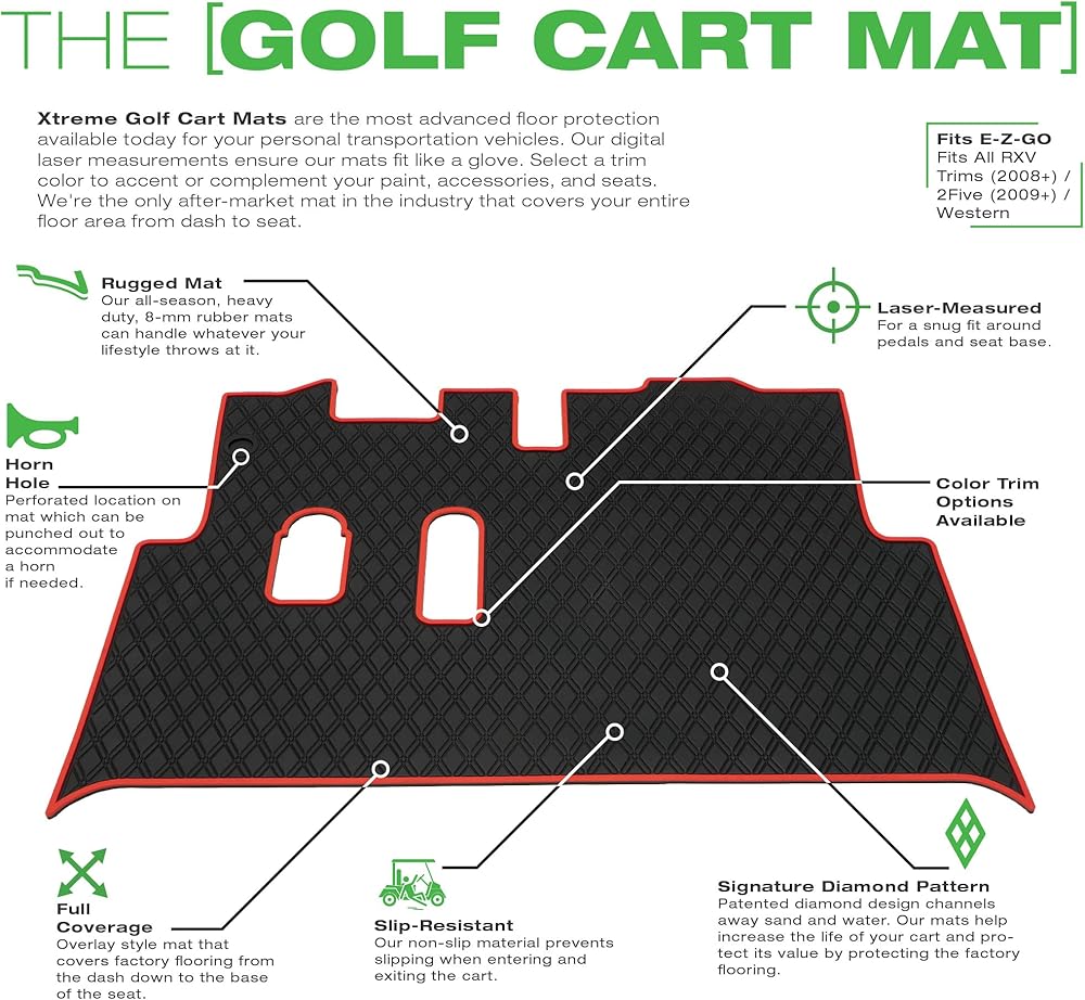 قم بترقية رحلتك - امنح عربة الجولف الخاصة بك عملية تجميل ورفع مستوى EZGO أو Club Car أو ICON أو Yamaha مع بطانات Xtreme Mats الخاصة بنا. مثالية لتعزيز عربة الجولف العادية أو الجديدة في الشارع أو استكمالها بملحقات عربة الجولف الموجودة لديك. متوفر باللون الأسود والرمادي والأحمر والأزرق والأخضر والبيج حسب اللون الذي تفضله. يتناسب جيدًا بشكل خاص مع أي أغطية مقاعد عربة جولف متطابقة.