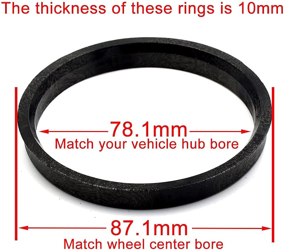 ONLY WORK for wheels with 87.1mm center bore and vehicles with 78.1mm hub bore. The thickness of these rings is 10mm
