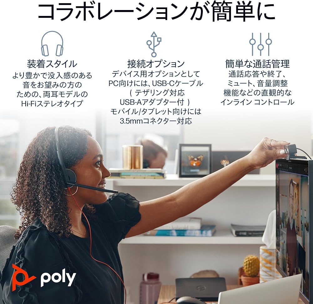 If you like the simplicity and reliability of corded headsets, you'll love the Poly Blackwire 3225. With a sleek design and flexible microphone boom for a customizable fit, this UC headset will keep you comfortable and productive throughout the day. Connect to a computer with USB-C or via USB-A with included USB-C to USB-A adapter, or to phone/tablet via 3.5mm connector and with our Poly signature audio, your workday is a breeze.