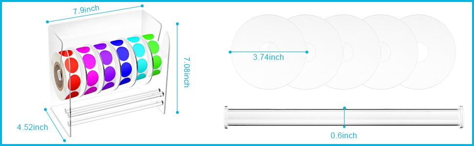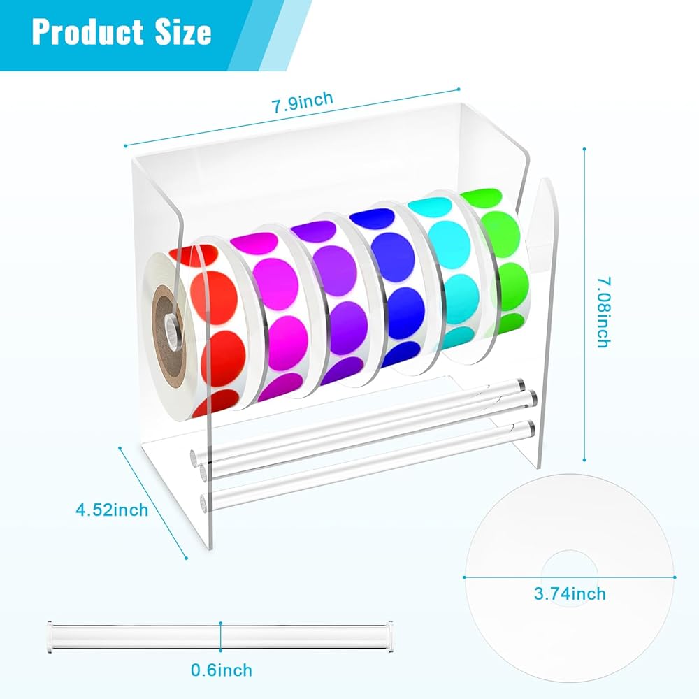 【تفاصيل حامل الملصقات】حجم موزع الشريط الأكريليك: 20 × 10.5 × 18 سم/7.87 × 4.13 × 7.08 بوصة. مجهزة بـ 5 أقراص قابلة للتعديل، القطر الخارجي 9.5 سم/3.74 بوصة (قطر الفتحة الداخلية 2.5 سم/0.98 بوصة). مساحة كافية لك لتنظيم ملصقاتك، لا داعي للقلق بشأن فقدان الملصقات، مما يوفر لك الكثير من الراحة. يمكن أن يحافظ على مكتبك مرتبًا، ويوفر منطقة عمل نظيفة ومرتبة، مما يجعله جذابًا بصريًا في أي مكان عمل.