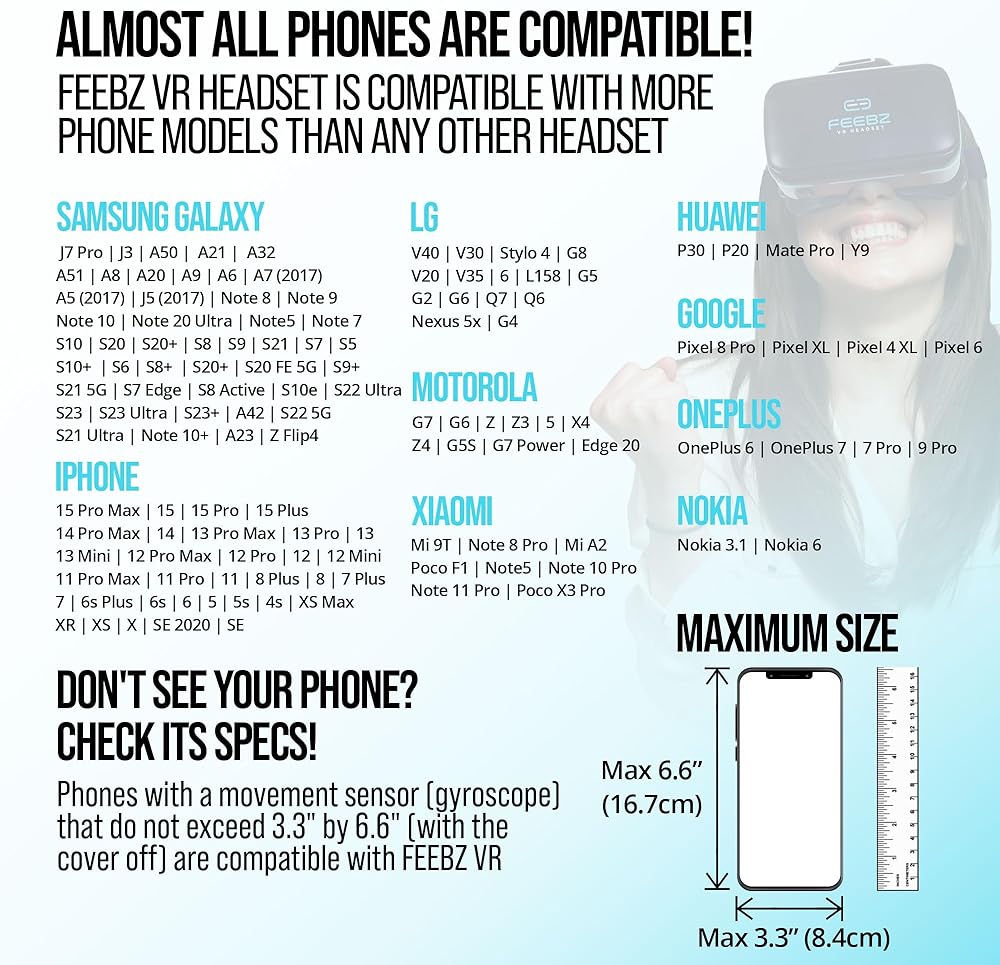 تناسب كل هاتف تقريبًا - تعمل سماعات Feebz VR مع جميع هواتف Android وiPhone القياسية التي يصل حجمها إلى 6.5 بوصة في حجم الشاشة
