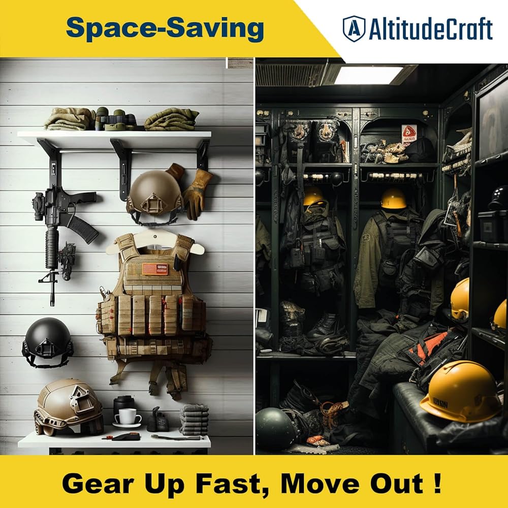 السلامة والمساحة وإعادة التعريف: ارفع إلى ما هو أبعد من المعتاد مع حامل رف التروس التكتيكي AltitudeCraft. فهو يتفوق على الحوامل التقليدية والأقواس الأساسية، ويوفر ثباتًا لا مثيل له، مما يضمن السلامة ضد الانقلاب والانفصال. مثالي للخوذ أو السترة، فهو حل آمن للأطفال يوفر المساحة، ويجلب النظام وسهولة الوصول إلى معداتك التكتيكية والمعدات الرياضية.