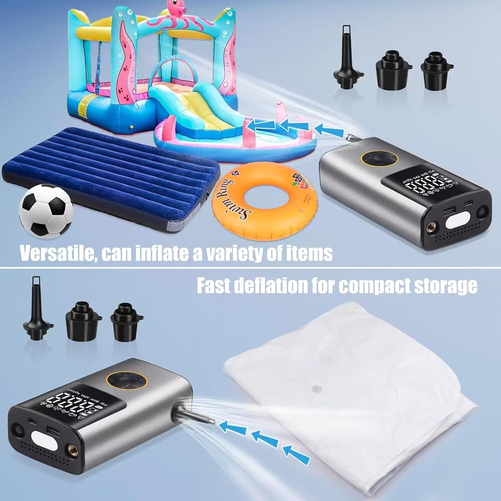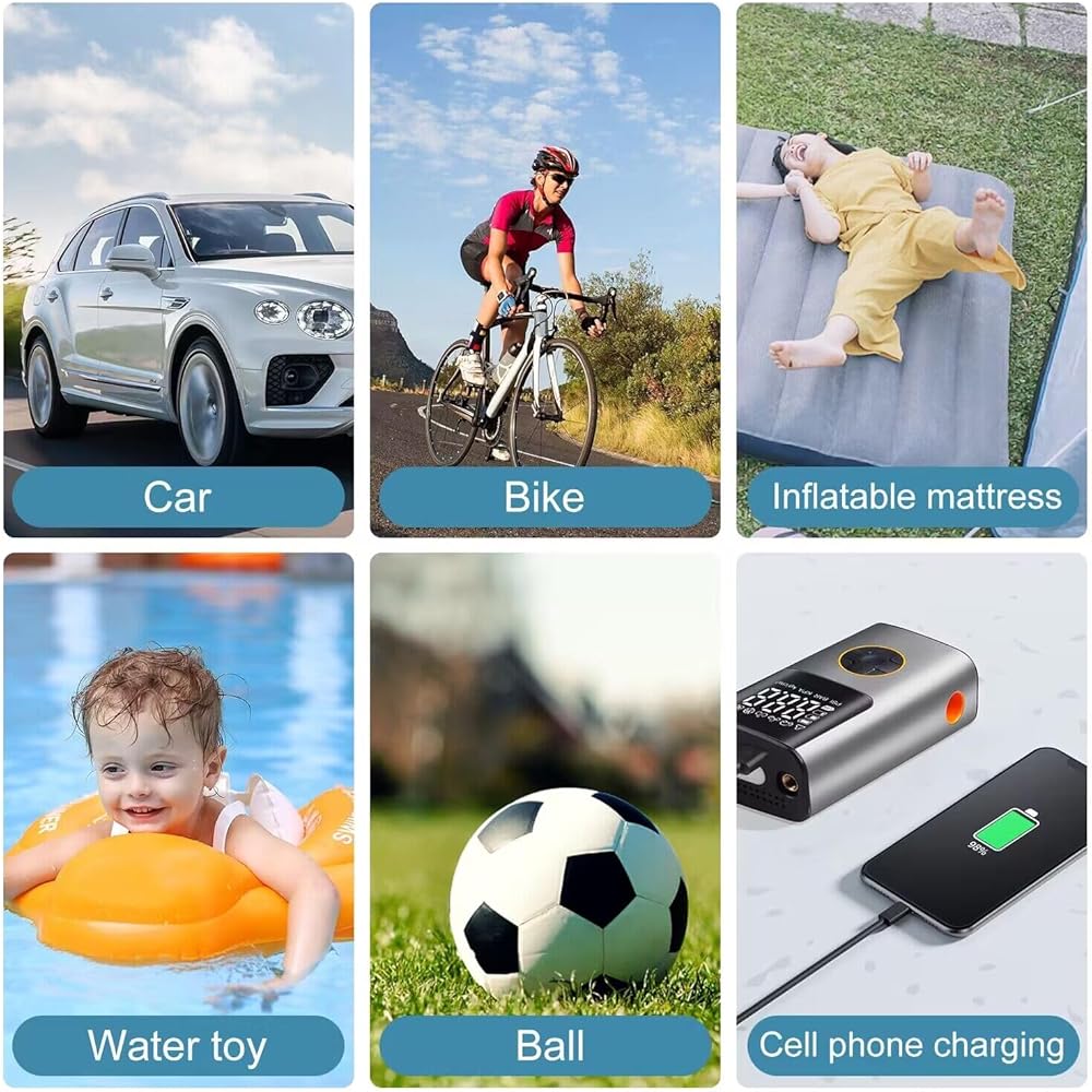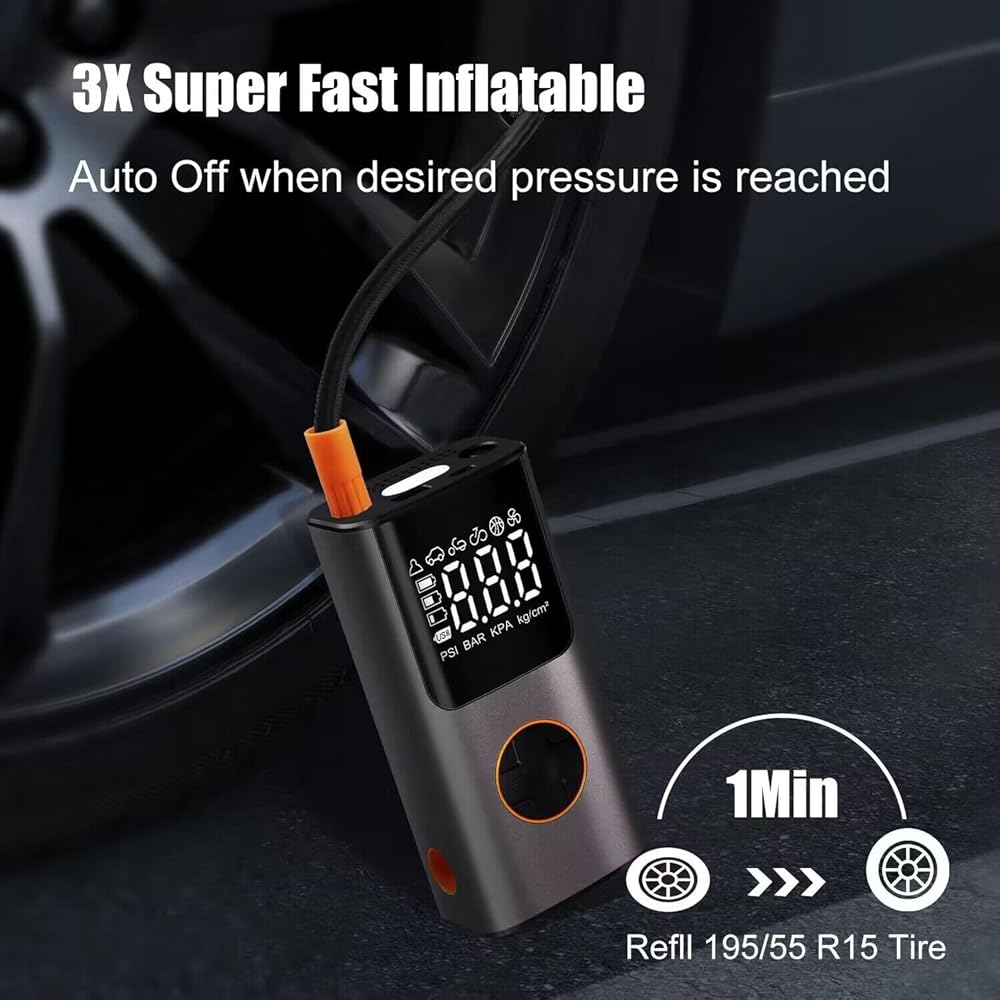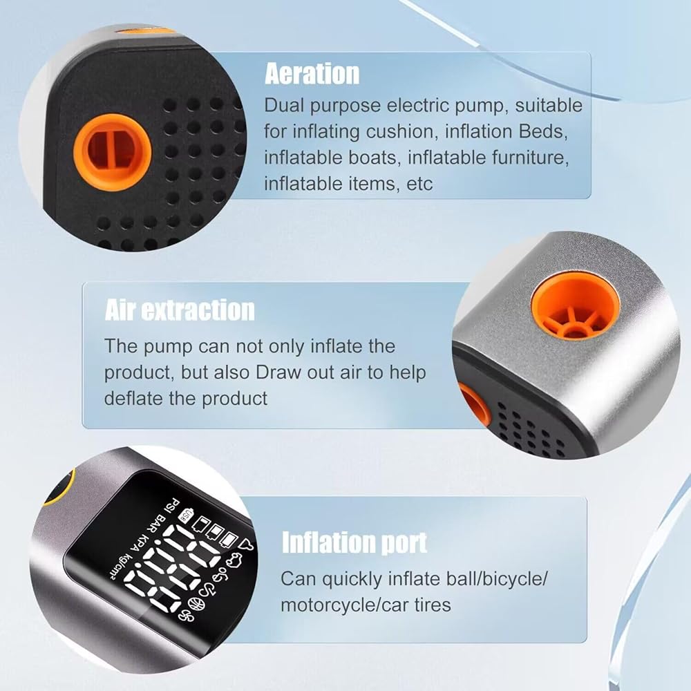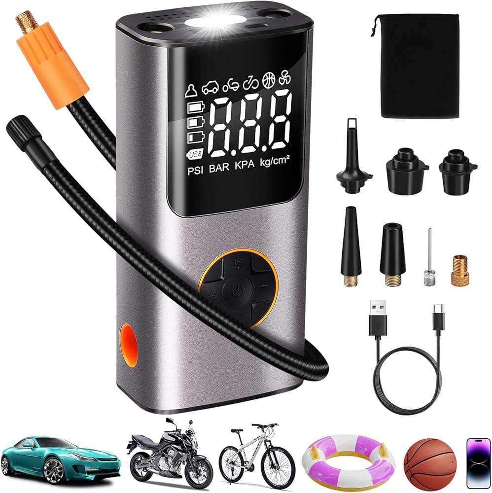 ضاغط هواء محمول منفاخ الإطارات: مضخة هواء كهربائية لاسلكية لإطارات السيارات - مضخة إطار دراجة 150 رطل لكل بوصة مربعة مع مقياس ضغط LCD رقمي للسيارة والدراجات النارية والدراجة والكرات وعوامات حمام السباحة