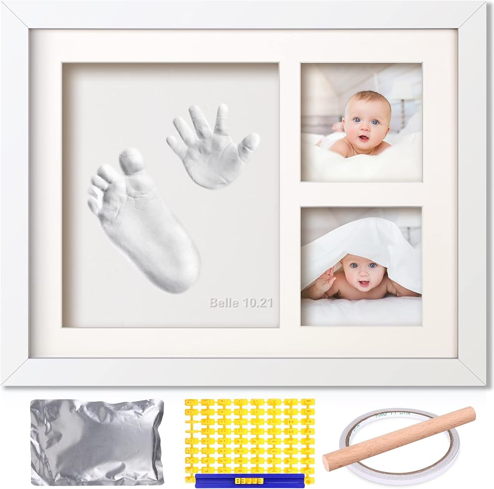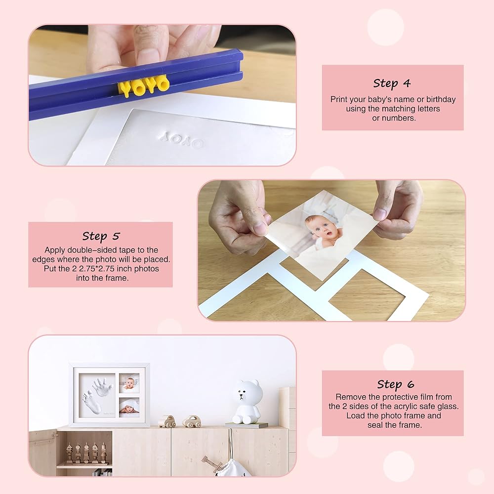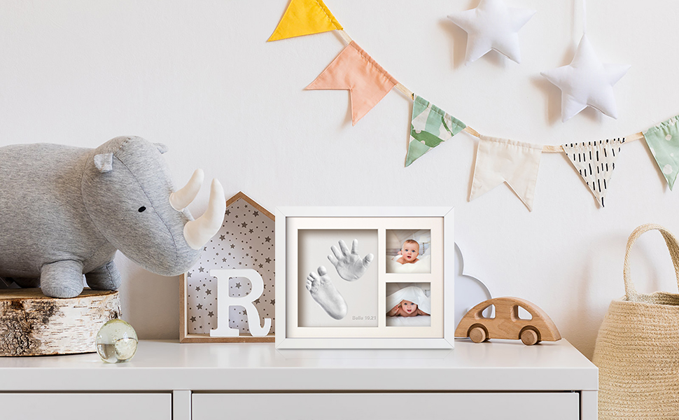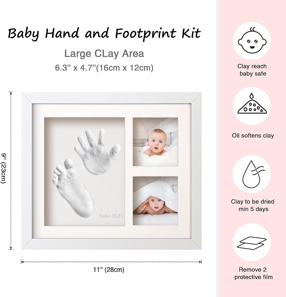 • إطار مخصص لبصمة اليد والقدم: تأتي مجموعة إطار بصمة اليد والقدم للأطفال مع مجموعة طباعة الحروف والأرقام لتفضيلاتك اليدوية، يمكنك ترك اسم طفلك في عيد ميلاد داخل الإطار للحصول على إبداع لا يُنسى. يمكن أيضًا استخدام إطار الصورة لليد والقدم كتذكار لمخالب الحيوانات الأليفة لصنع ذكريات ثمينة لقطتك أو كلبك.