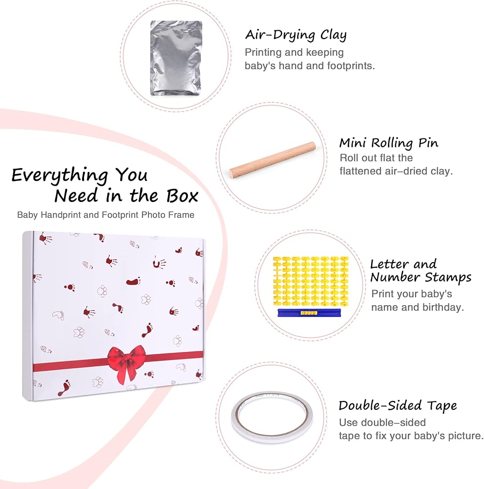 • مجموعة آثار أقدام آمنة: مجموعة آثار أقدام الأطفال حديثي الولادة مجهزة بالطين عالي الجودة الذي تم اعتماده آمن غذائيًا وغير سام وخالي من الرصاص وغير ملوث وآمن بنسبة 100% لطفلك. الإطار الخشبي الصلب المطابق والزجاج اللامع والمتين المقاوم للسقوط (يرجى إزالة الغشاء الواقي على جانبين من الزجاج عند الاستخدام) يعرض بوضوح صور ملاك طفلك الجميلة وآثار يد طفلك وقدميه.