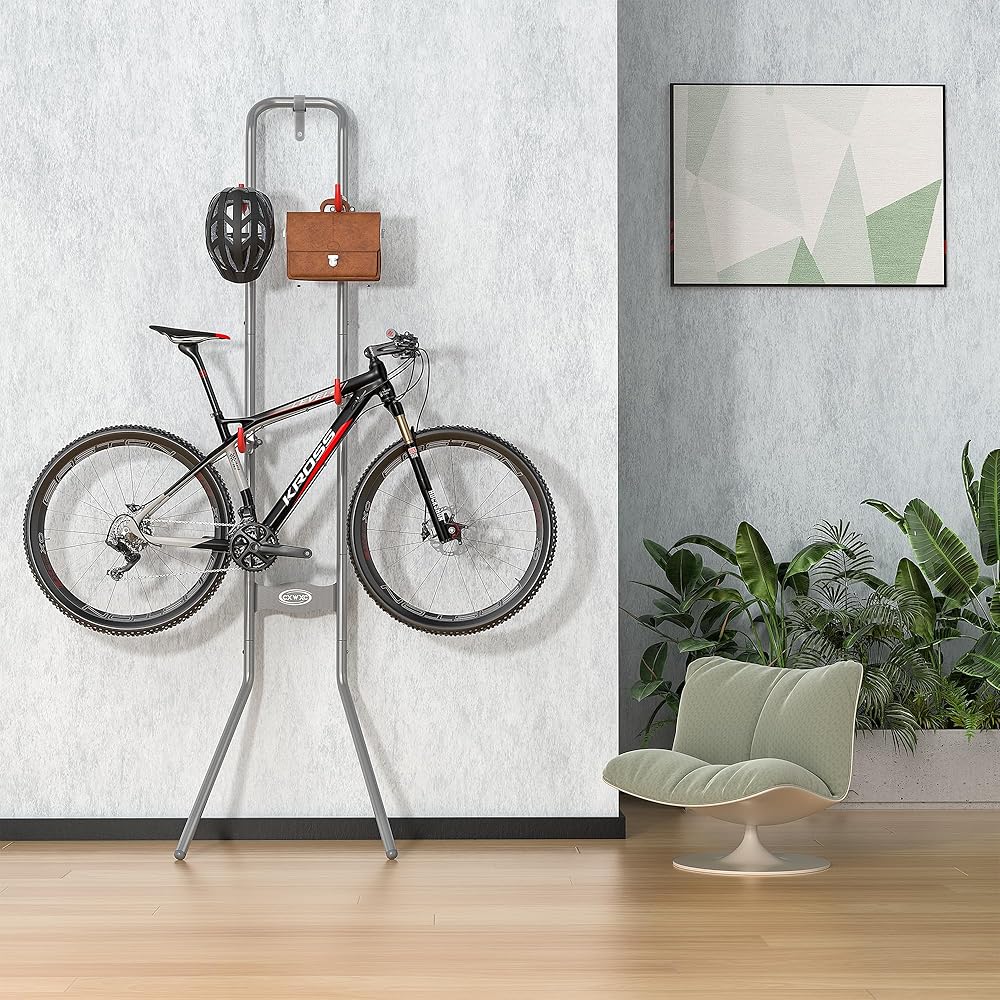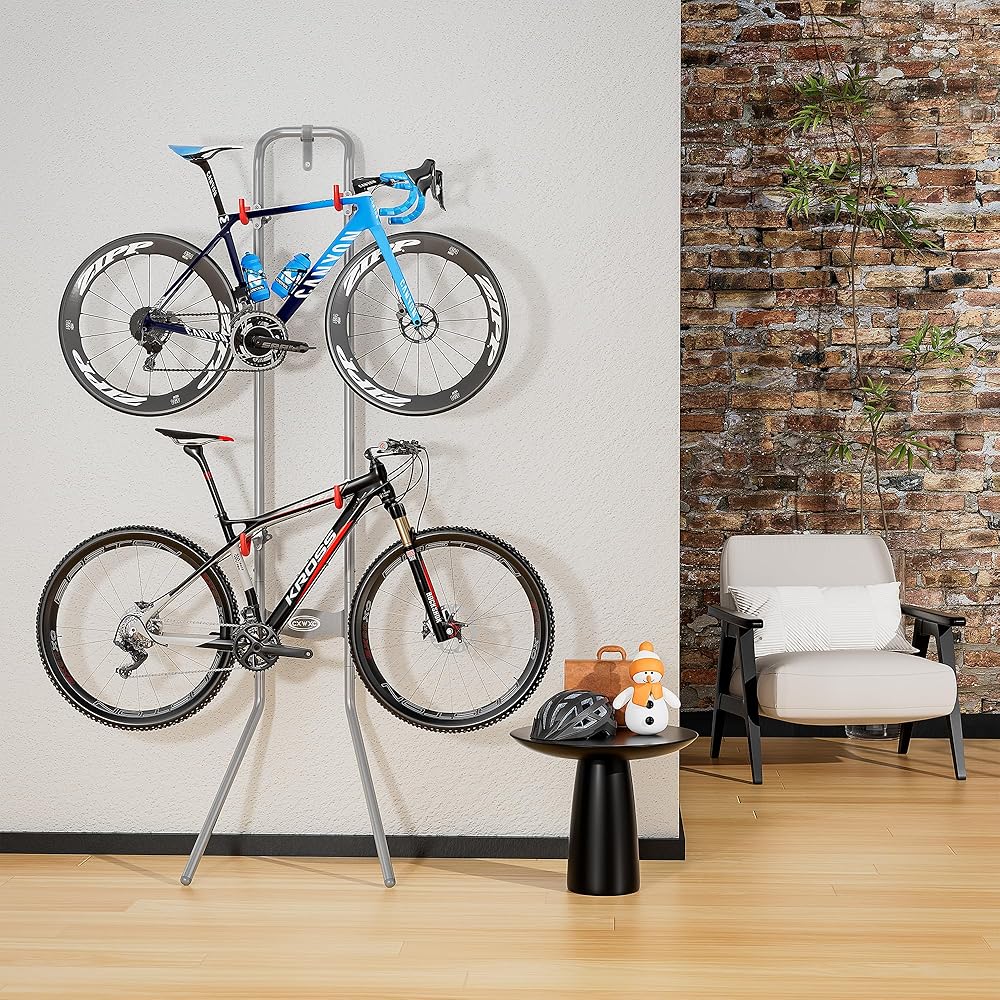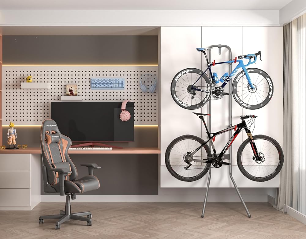 تركيب سريع وسهل: يميل حامل الدراجة على الحائط الخاص بك ويستخدم قوة الجاذبية لحمل دراجتين من أي نمط، أو ما يصل إلى 120 رطلاً في الوزن الإجمالي (بحد أقصى 60 رطلاً لكل دراجة). خارج الصندوق، يمكن تجميع الحامل في دقائق معدودة فقط باستخدام مفك براغي فيليبس. بالنسبة للدراجات الأثقل، مثل الدراجات الإلكترونية، يتم تضمين حزام تثبيت على الحائط لتجنب أي سقوط عرضي (بالنسبة للدراجات الثقيلة حقًا، ابق على الجانب الآمن وقم بتخزينها فقط على الدرجات السفلية).
