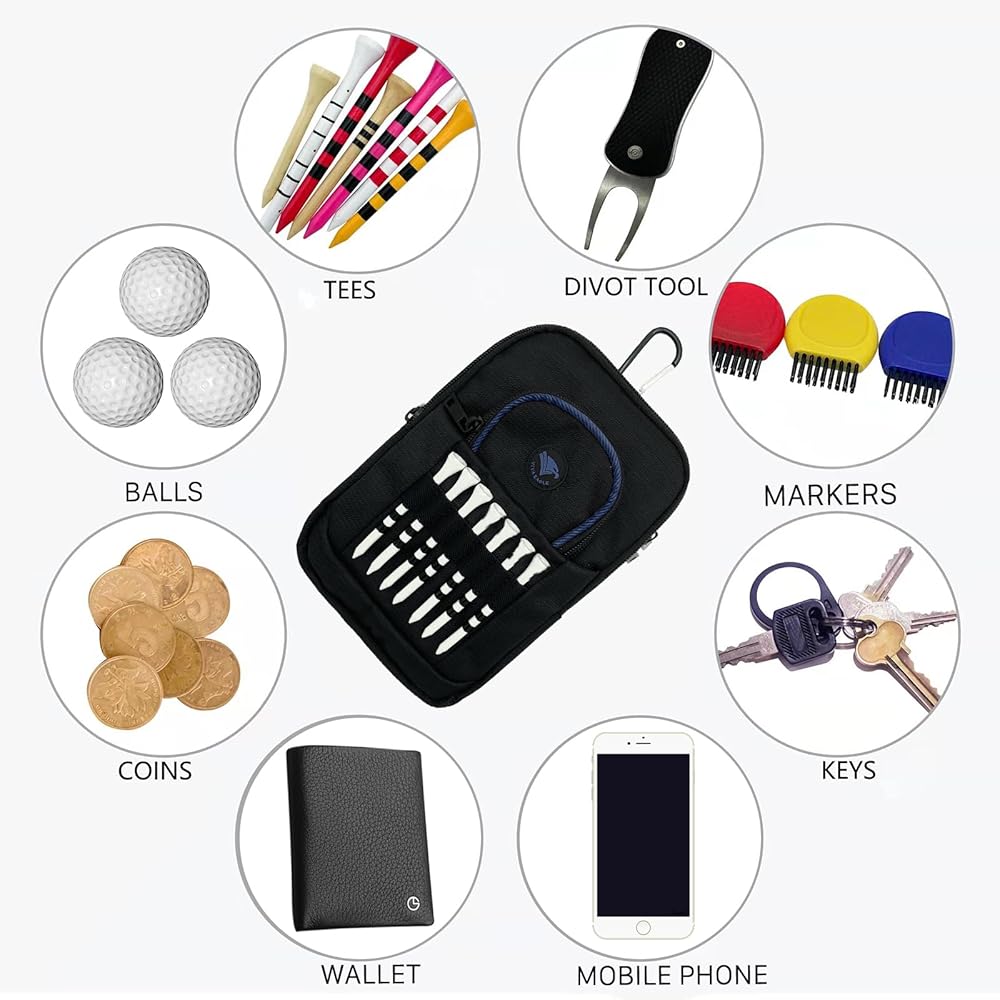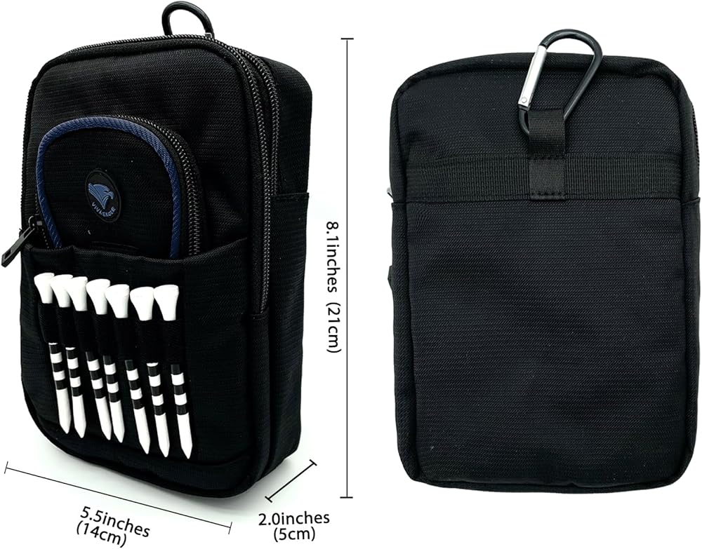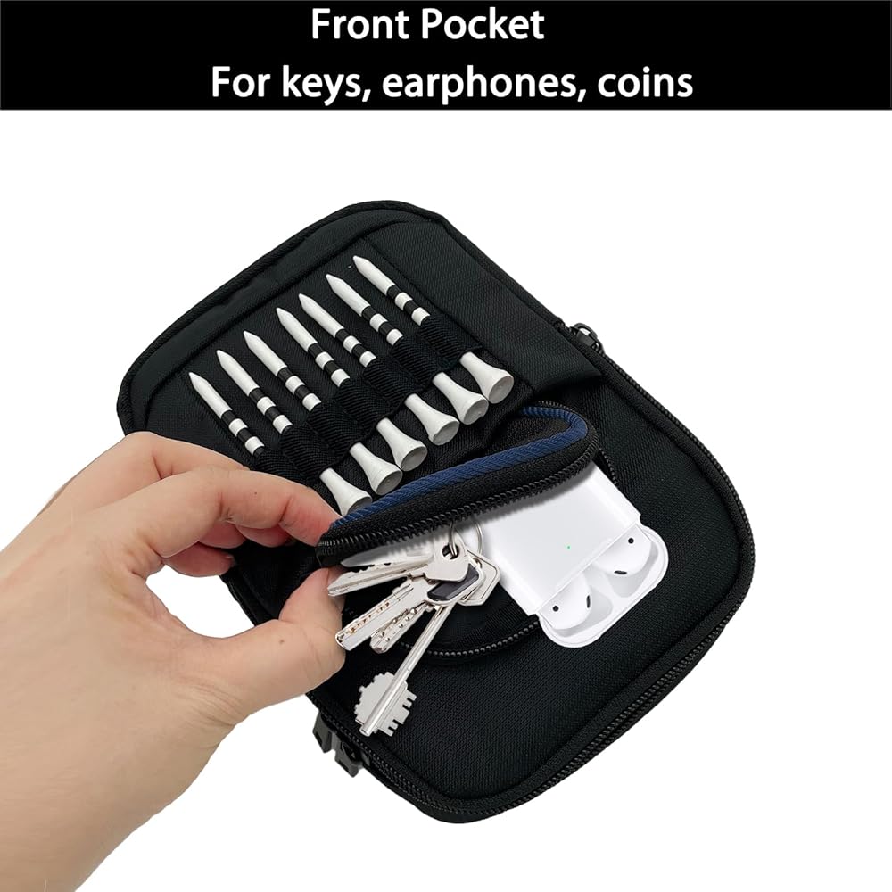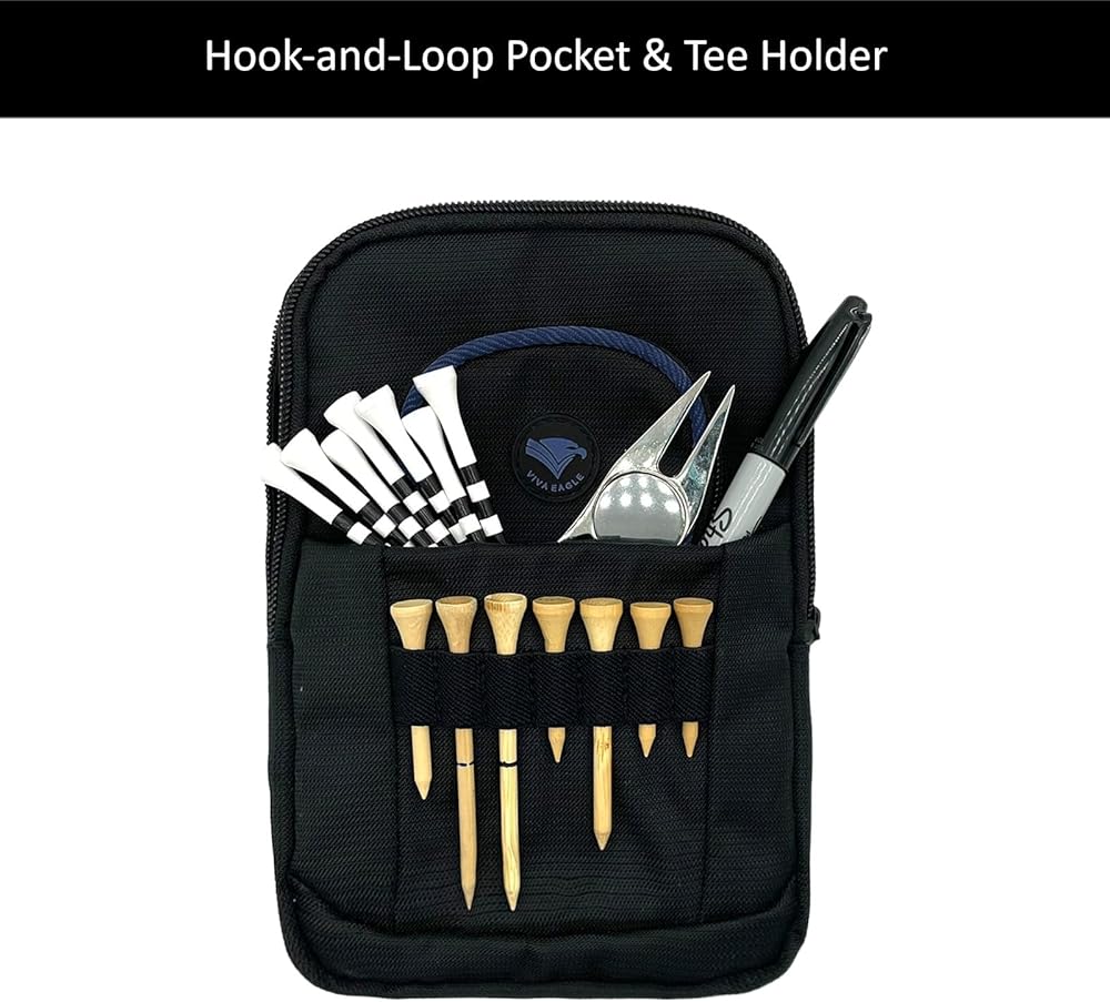 احمل كل ما تحتاجه في دورات الجولف - يتميز بـ 3 جيوب واسعة بسحاب، وأكمام إغلاق فيلكرو، وحامل تي شيرت أمامي مع 7 فتحات. حجم الحقيبة: 5.5 بوصة (عرض) × 2.0 بوصة (طول) × 8.1 بوصة (ارتفاع) مصنوعة من نسيج النايلون المتين.