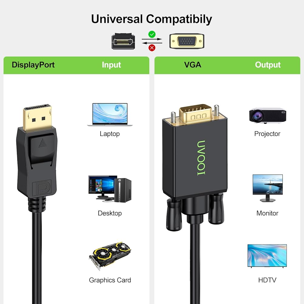 كابل DisplayPort إلى VGA بطول 3 أقدام، سلك محول Display-Port DP إلى VGA ذكر مطلي بالذهب متوافق مع Dell وHP Lenovo وASUS والمزيد - أسود