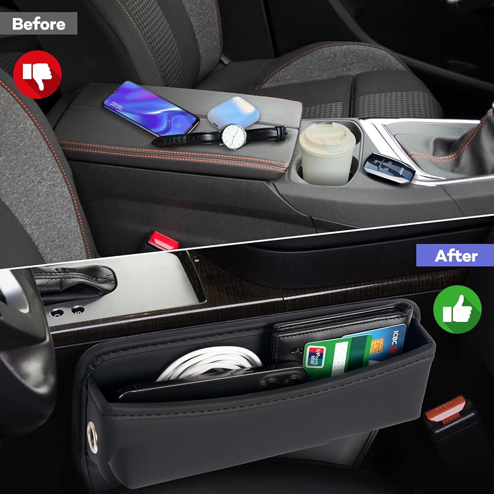 تنظيم المساحة: إذا كانت لديك مشكلة في فقدان الأشياء في شقوق مقعد السيارة، فإن منظم مقعد السيارة هذا هو مساعدة رائعة. يمنع منظم حشو فجوة مقعد السيارة العناصر الصغيرة من السقوط بين طبقات مقعد سيارتك ويوفر لك جيبًا على متن السيارة للعملات المعدنية والبطاقات والهواتف المحمولة وغيرها من الأشياء الصغيرة ويبقيها في متناول اليد.