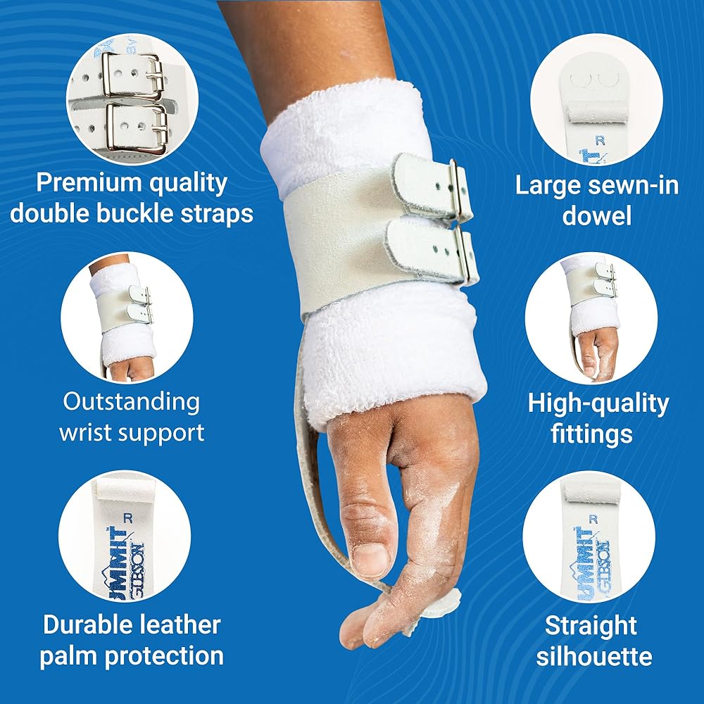 The Summit grip is ideal for gymnasts who need a grip wider than a junior grip, but prefer to feel more of the bar. Easy to break in. Made in the USA from top quality leather, Sold in Pairs