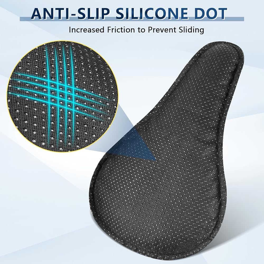【جيدة التهوية ومضادة للانزلاق】: توفر وسادة مقعد الدراجة الراحة من خلال سطح مسامي يسهل امتصاص الرطوبة وتبديد الحرارة، مما يضمن التجفيف السريع. يعمل التصميم المريح مع أخدود التوجيه الفريد على تحسين تشتيت الحرارة للحفاظ على مقعد بارد للأرداف. علاوة على ذلك، يمنع نسيج السطح المضاد للانزلاق الانزلاق غير المرغوب فيه أثناء الركوب.