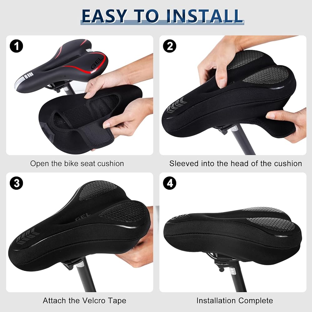 【🌟الثبات وسهولة التركيب】: يستخدم غطاء وسادة مقعد الدراجة الجل تصميم شريط فيلكرو من أجل ملاءمة آمنة على مقعد الدراجة الخاص بك. تمنع نقاط السيليكون غير القابلة للانزلاق الموجودة على الجزء الخلفي من الغطاء الحركة، مما يضمن الثبات أثناء الركوب. أربع خطوات تركيب، لا حاجة لأي أدوات.