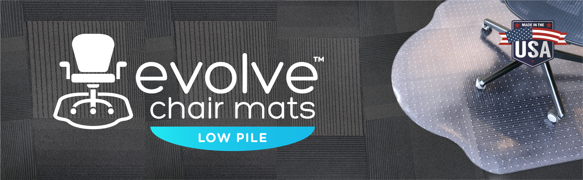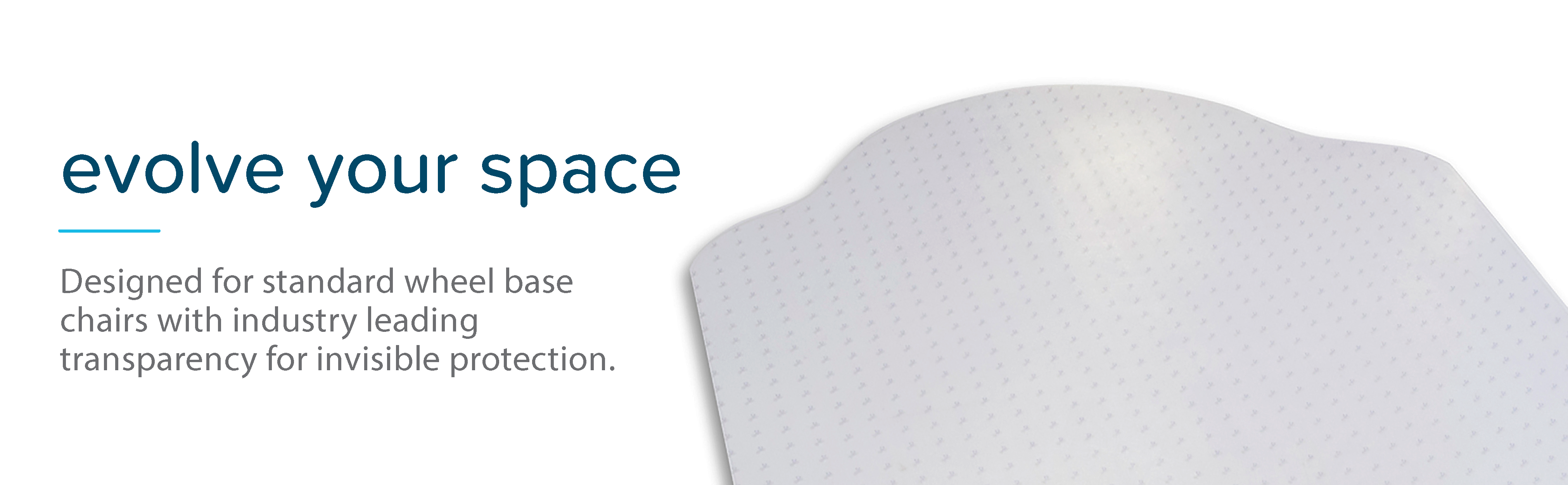 Replacing or repairing floors can be expensive. Protect your investment with a durable Evolve Chair Mat engineered to protect your floor from wear due to the wheels of your office chair rolling back and forth over time. The 39" x 52" Evolve Modern Shape Chair Mats have a 26.2" wide x 9.1" deep tapered front lip. The rounded back corners accommodate the circular footprint of 5-star wheel base chairs, offering more efficient use of the mat surface. Designed with industry leading clarity, Evolve mats seamlessly fade into your floors, perfect for low pile carpet floor surfaces including berber, loop, sisal, velour, and carpet tiles. Not recommended for use on hard floors, area rugs, throw rugs, or medium to high pile carpets. Evolve chair mats are backed by a 1 year warranty that guarantees the chair mat is free from manufacturer defects, limited to replacement of the mat only and excludes special or consequential damages.