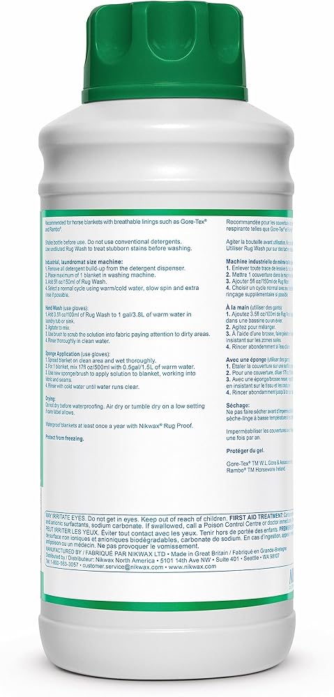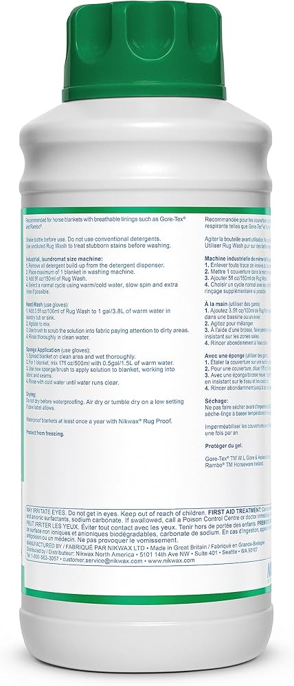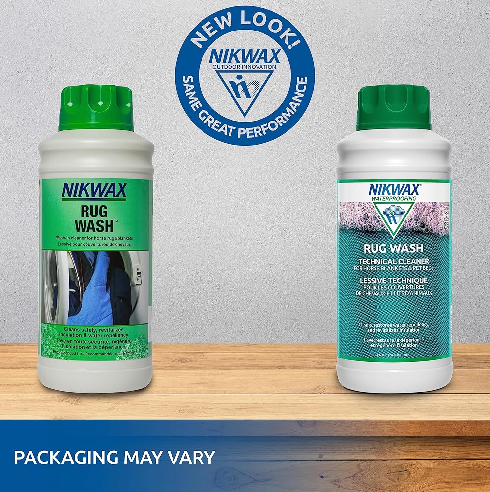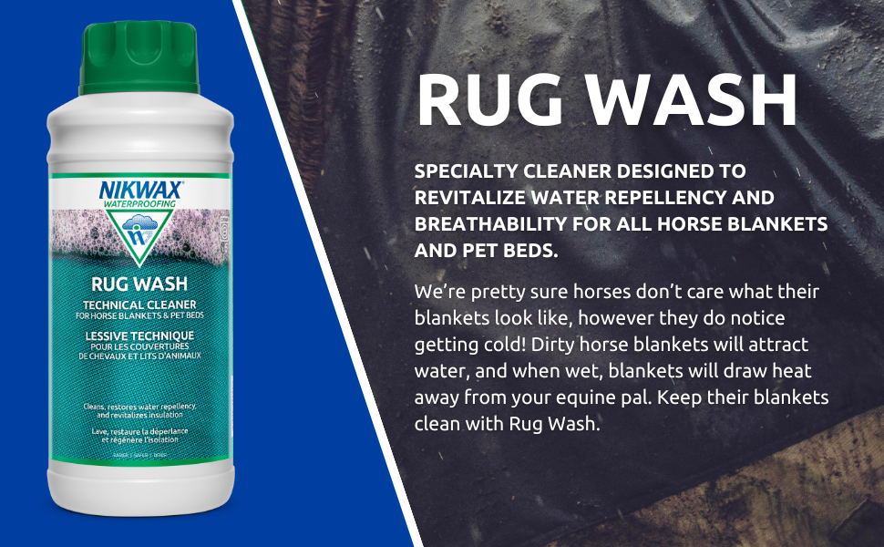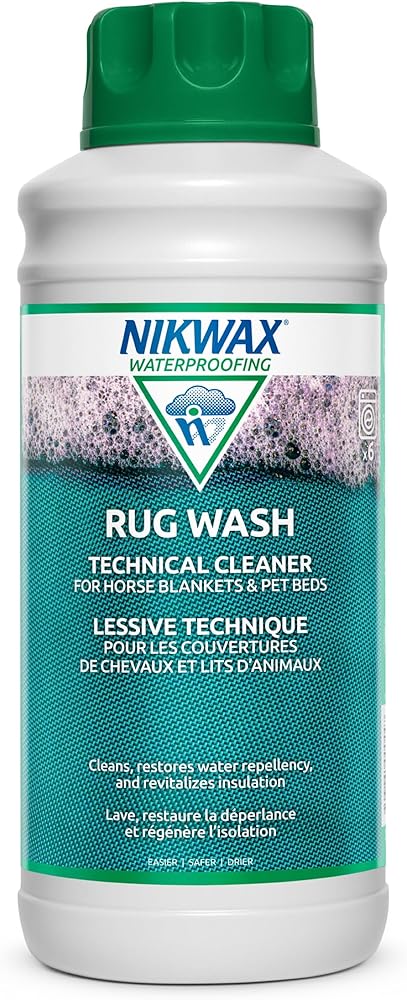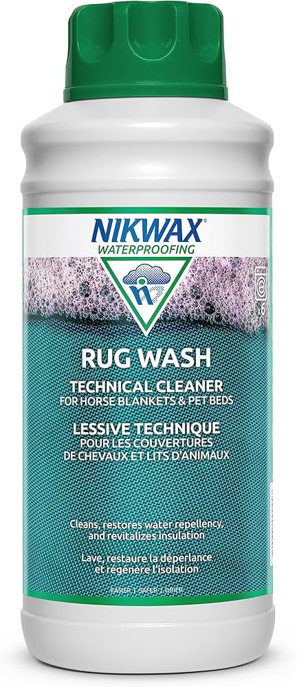Nikwax Rug Wash safely cleans your canvas/synthetic horse blankets