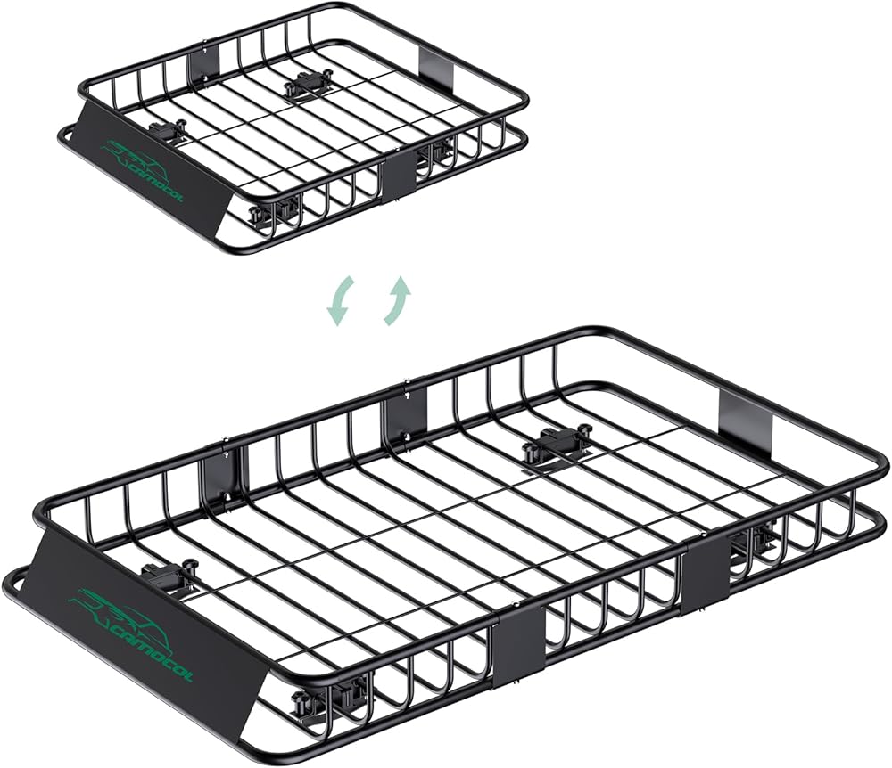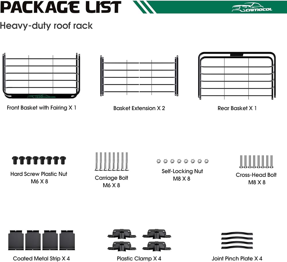 【هيكل عالي التحمل】السلامة أولاً! رف البضائع CAMOCOL مصنوع من الفولاذ عالي التحمل لمزيد من القوة ومقاومة الطقس، مما يوفر عدة سنوات من الاستخدام طويل الأمد. ستحافظ القضبان الجانبية المعدنية العالية مقاس 6 بوصات الموجودة في سلال رفوف السقف لدينا على أمان أغراضك أثناء السفر