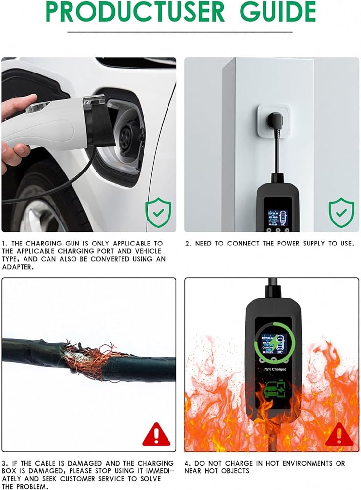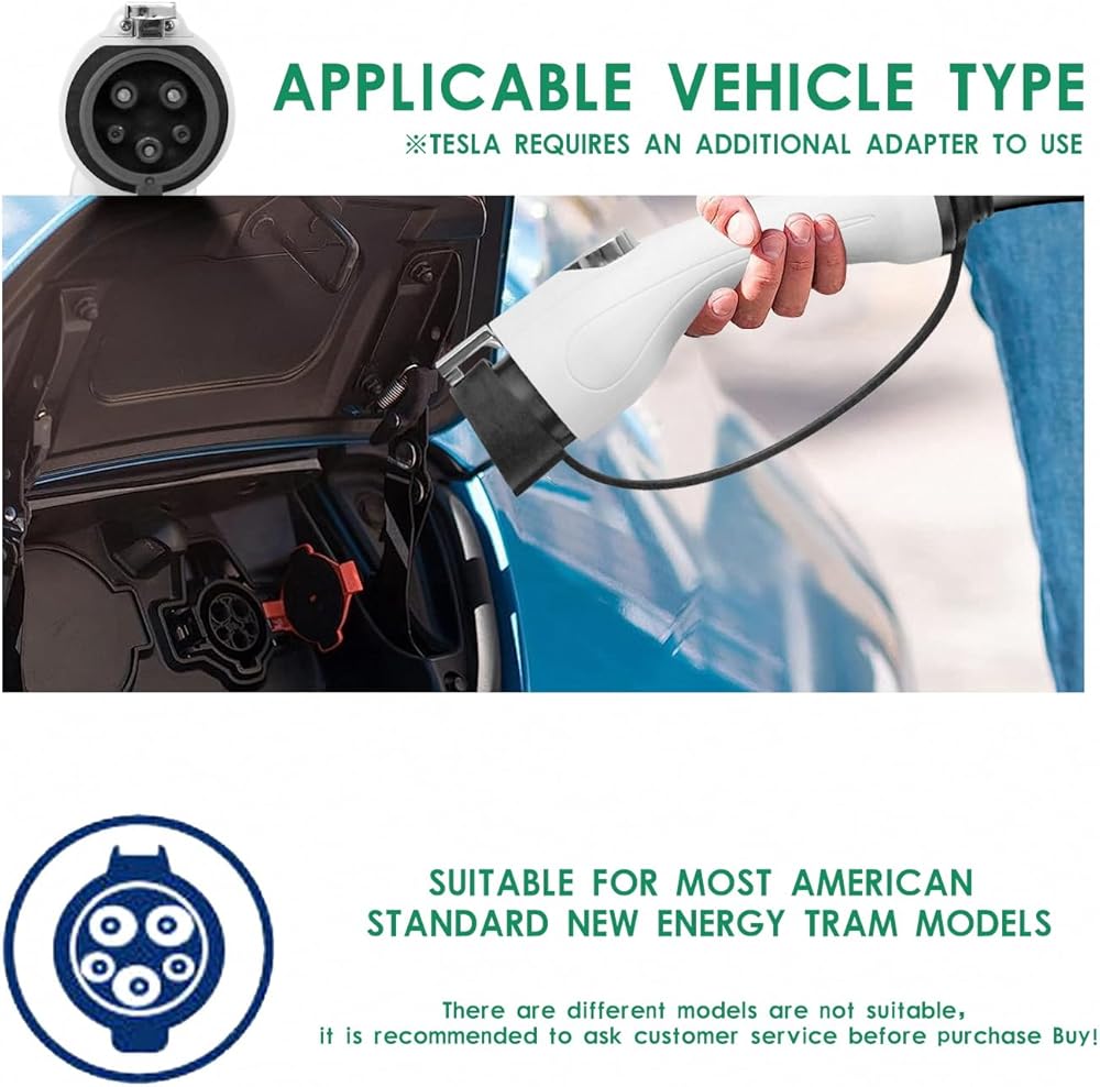 Universal Compatibility: Supporting 110V and 240V charging, the EV Charging Station is compatible with a wide range of electric vehicles. The J1772 plug meets the standard requirements for most EVs in North America, and Tesla owners can utilize a Tesla Compatible Charger for seamless integration. This charger's universal design ensures compatibility with both current and future EVs, making it a valuable addition to any EV owner's toolkit.