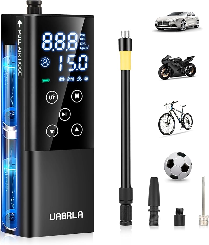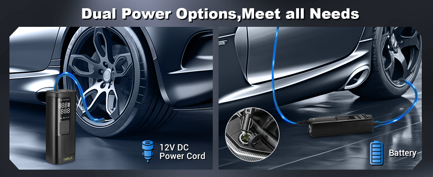منفاخ الإطارات 2 في 1: منفاخ الإطارات المحمول مجهز بإمدادات طاقة مزدوجة ويمكنه التبديل بين الشحن اللاسلكي والكهربائي في أي وقت. تحتوي مضخة الهواء الكهربائية على بطارية مدمجة قابلة لإعادة الشحن يمكنها نفخ السيارة مباشرة بعد الشحن الكامل. لا داعي للقلق بشأن نفاد البطارية على الطريق لأن ضاغط الهواء المحمول مزود بسلك طاقة 12 فولت تيار مستمر لحالات الطوارئ الإنقاذ على الطرق.