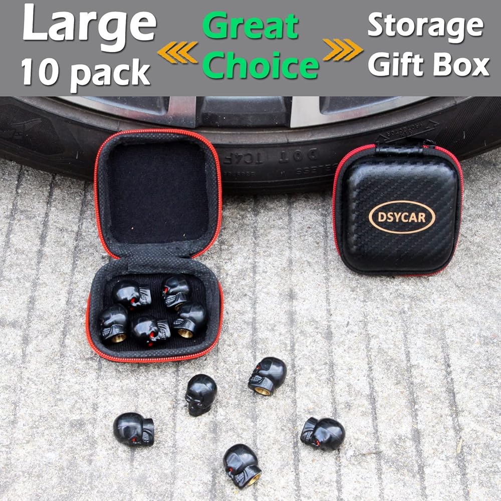 مجموعة أغطية صمامات جذعية كاملة للإطارات - سوف تحصل على 10 أغطية صمامات إطارات جمجمة لتغطية جميع سياراتك مع إضافات احتياطية. تأتي مع حقيبة صغيرة بسحاب، مما يسهل تخزين أغطية جذعية صمام الجمجمة الإضافية في مجموعة أدواتك. لذلك عندما يسرقها أحد الأشرار، أو إذا كنت بحاجة إلى تبديل أغطية الإطارات بمرور الوقت، فلديك بدائل.