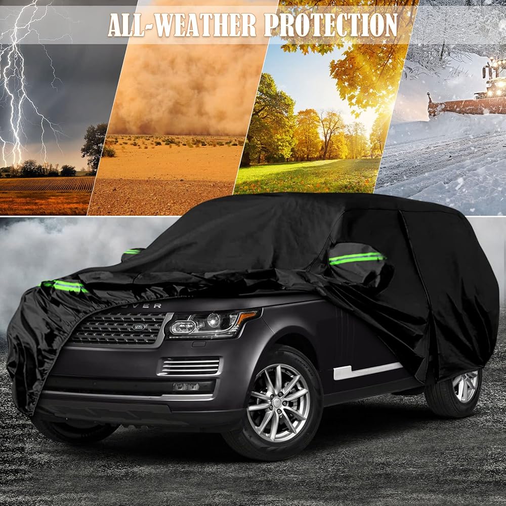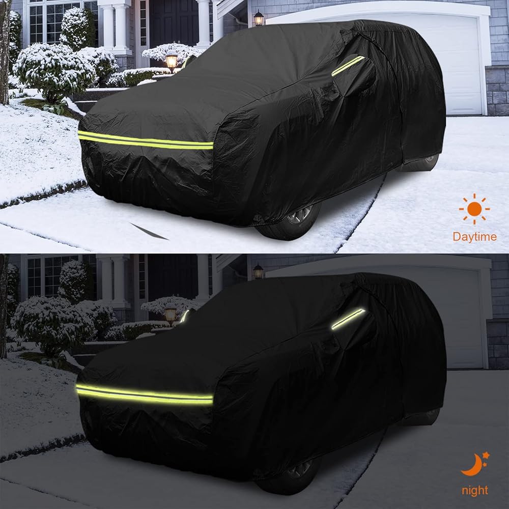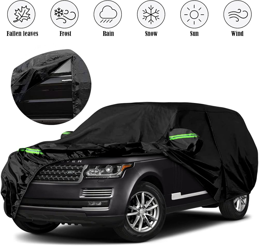 مواد فاخرة: مصنوعة من 6 طبقات من المواد شديدة التحمل: 1: الجزء الخارجي مصنوع من مادة 210T، يمكنها تحمل التعرض لأشعة الشمس في الصيف والمطر/الثلج في الشتاء (ضغط مقاوم للماء يصل إلى 2000 مم) 2: الألومنيوم عالي الانعكاس جيد في مقاومة الشمس، ويحافظ على برودة السيارة في الجو يوم مشمس. 3. دعامة داخلية من القطن السميك لحماية طلاء سيارتك