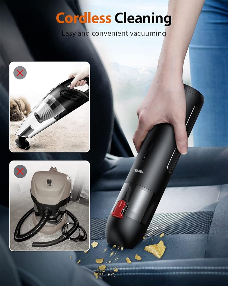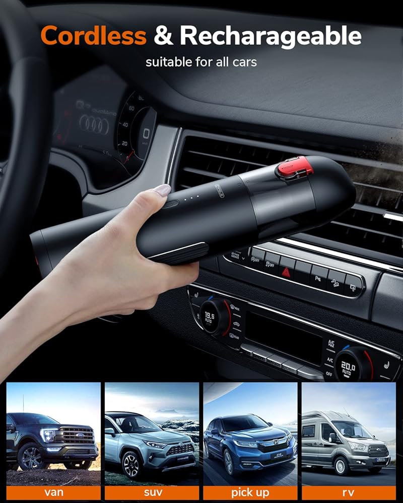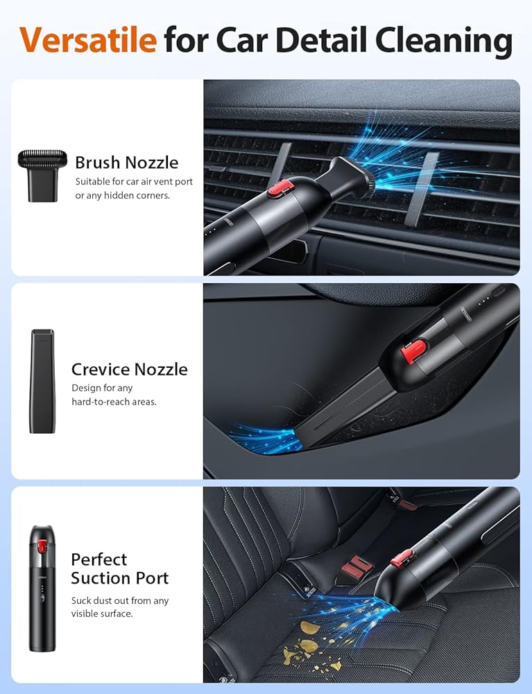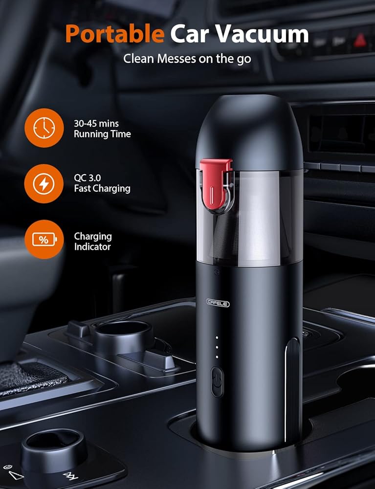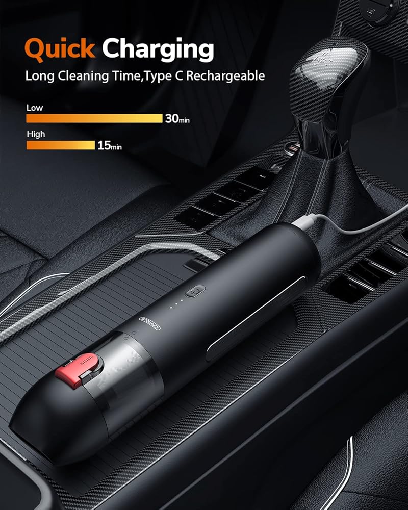 【تنظيف بدون جهد، في أي مكان】: توفر مكنسة السيارة التي تعمل بالبطارية ما يصل إلى 30 دقيقة من الشفط القوي مع بطارية قابلة لإعادة الشحن بقوة 7500 مللي أمبير في الساعة يتم شحنها بالكامل خلال ساعتين فقط. استمتع بالتنظيف السهل، سواء كنت في الخارج أو في المنزل، واقضي المزيد من الوقت في فعل ما تحب.