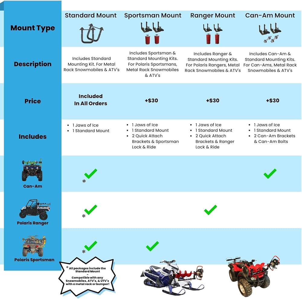 توافق التركيب: سيتم تركيب الحامل القياسي على أي مركبة ATV أو عربات الثلوج ذات رفوف معدنية. سيتم تركيب Sportsman Mount على أي Polaris Sportsman. سيتم تركيب Ranger Mount على أي Polaris Ranger UTV. سيتم تركيب Can-Am Mount على Can-Am ATV.