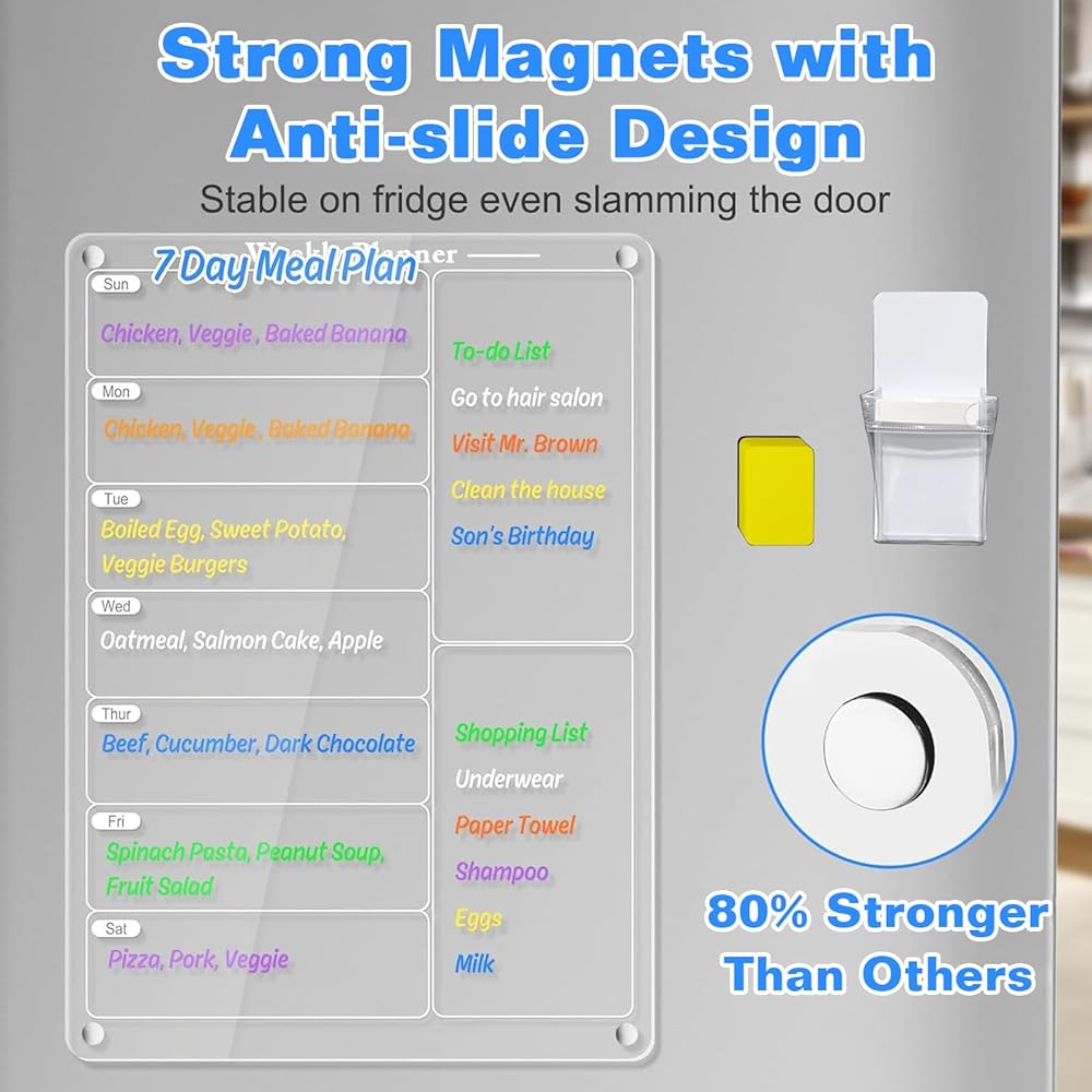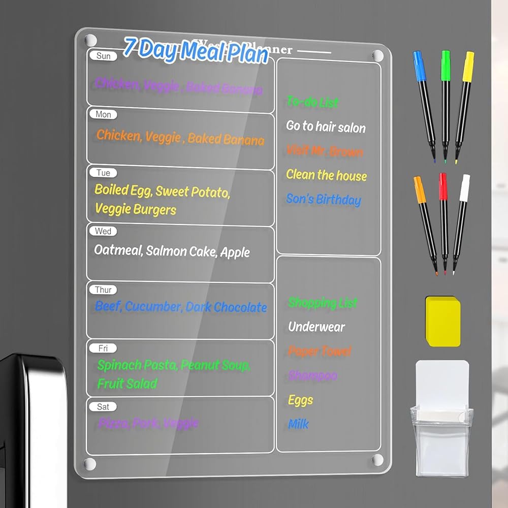 تصميم مبتكر: يمكن استخدامه لتسجيل خطة الوجبات اليومية، وقائمة الطعام، وخطة الشراء، وما إلى ذلك. من الاثنين إلى الأحد، ويمكن استخدامه أيضًا كمذكرة. قد يكون من المناسب تسجيل قائمة العناصر على لوحة الوصفات الأسبوعية، أو قائمة التسوق، أو قوائم المهام المهمة لمساعدتك على تنظيم حياتك اليومية بشكل أكثر فعالية.