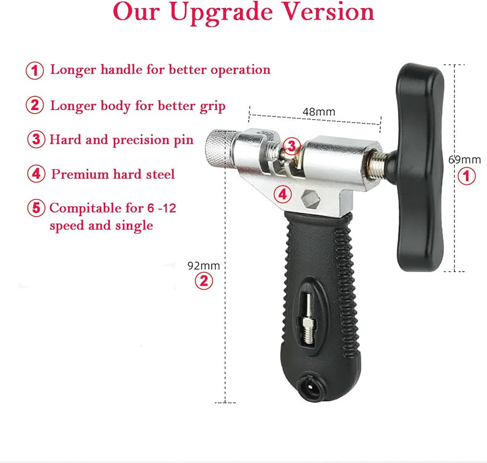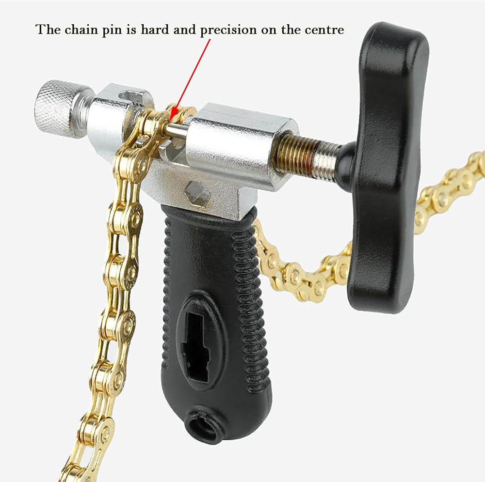 تصميم ذكي لسهولة التشغيل: يوفر الأخدود الفريد الموجود في الجزء العلوي من أداة كسر سلسلة الدراجة دليلًا مرئيًا، مما يجعل من السهل تحديد مدى دفع دبوس السلسلة للخارج. يؤدي ذلك إلى تبسيط عملية إزالة السلسلة ويسمح بإزالة السلسلة المقطوعة بسهولة مع إزالة الدبوس.