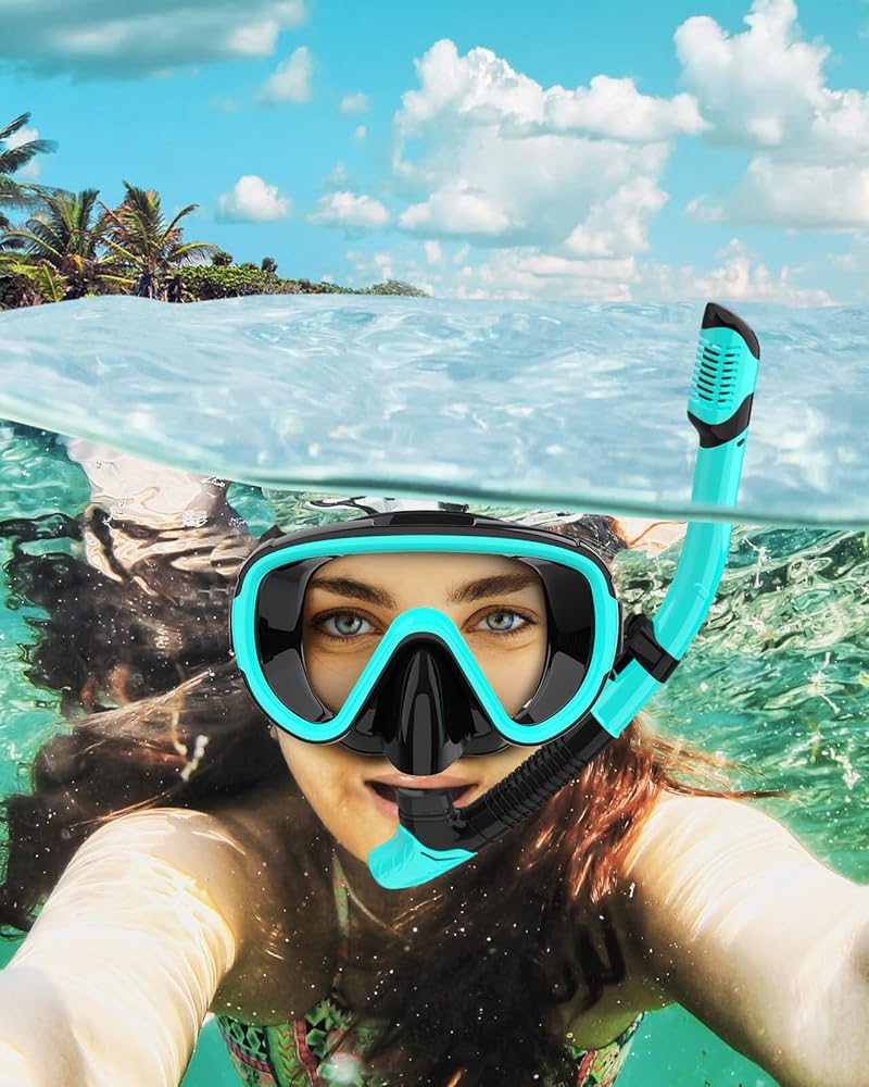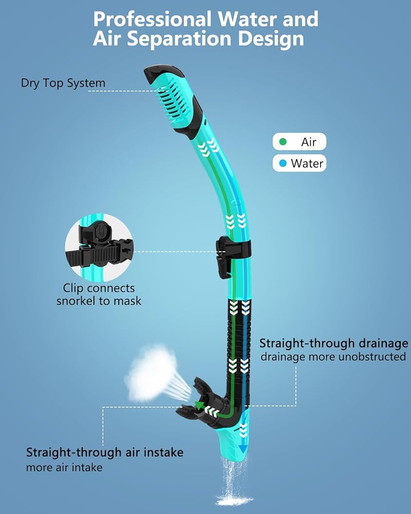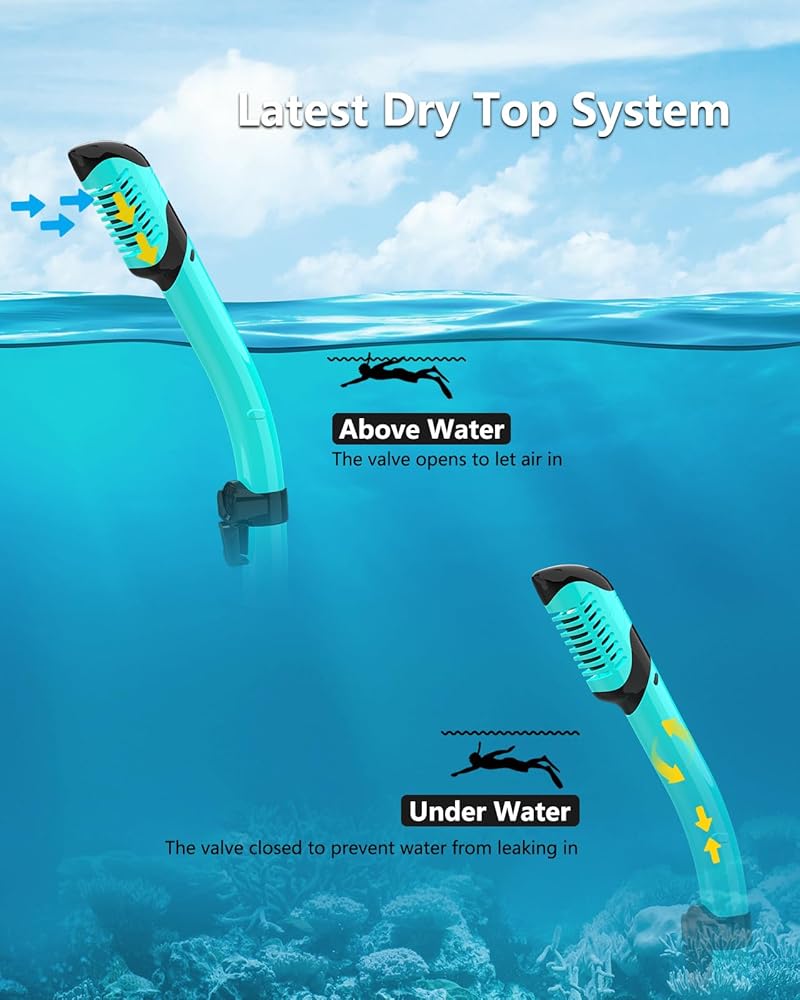 • 【غوص آمن】عندما يدخل الجزء العلوي من أنبوب الغطس إلى الماء، يغلق الصمام لمنع دخول الماء؛ عندما يكون الجزء العلوي من أنبوب الغطس فوق الماء، يفتح الصمام للسماح بدخول الهواء، مما يسهل التنفس.