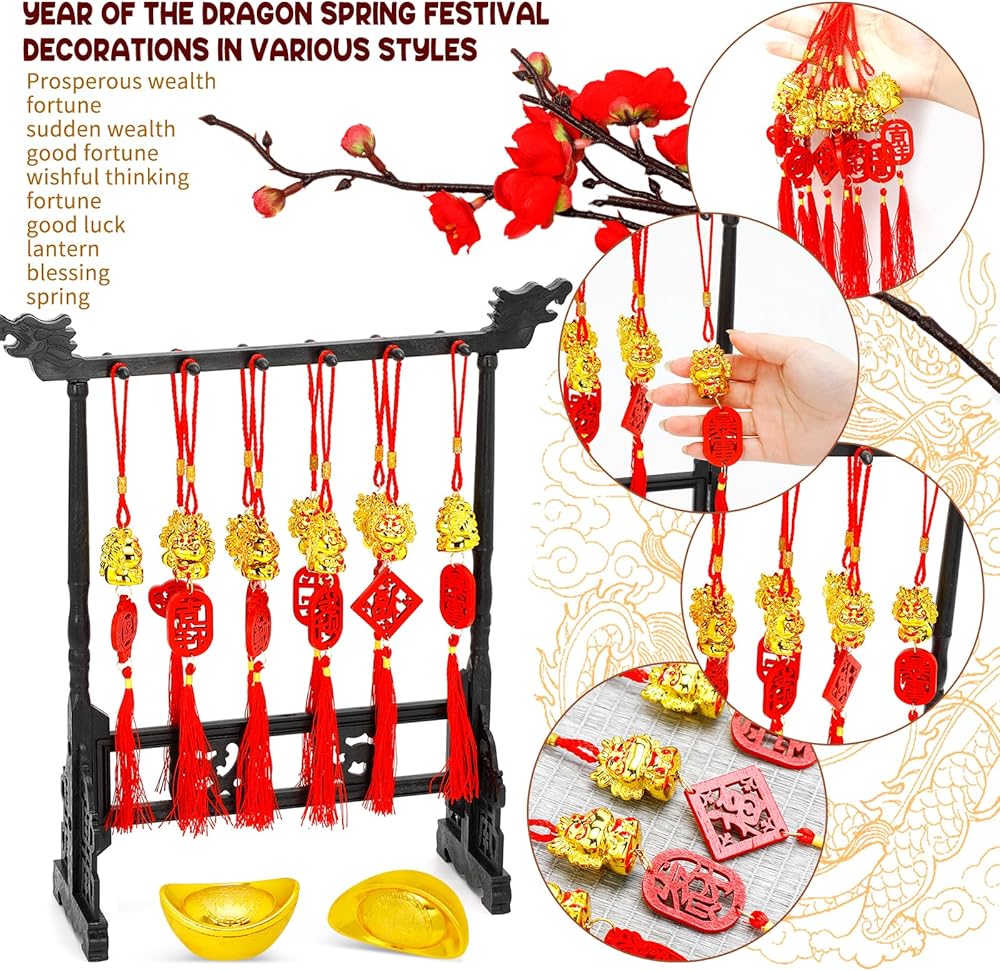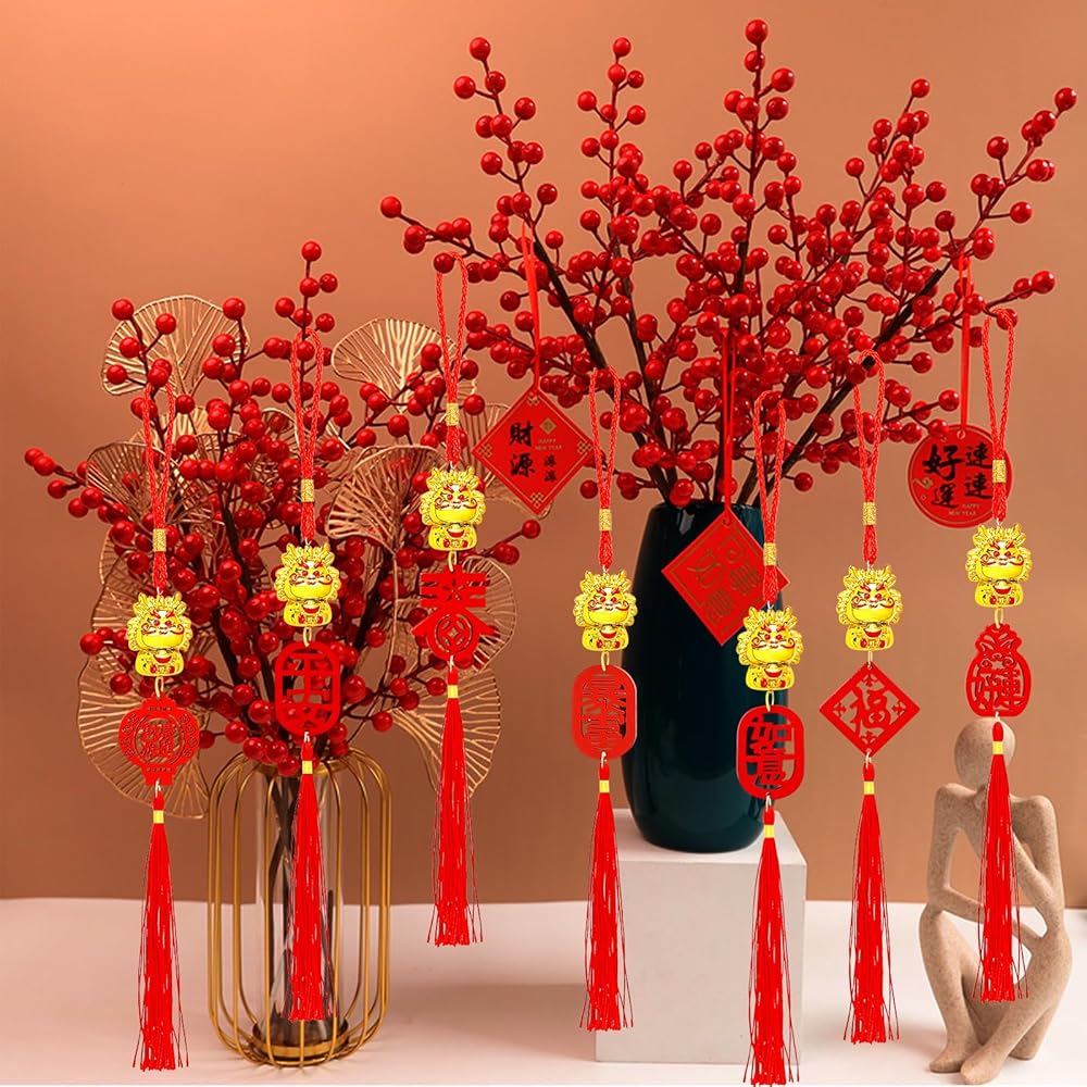 • زينة عام التنين: مصممة بعناصر تقليدية صينية مختلفة مثل العقدة الصينية، وقلادة التنين، وتوفر العقدة الصينية الحمراء معنى ميمونًا مع اللون الأحمر الكلاسيكي، وترمز إلى الحظ السعيد المزدوج، والصحة المزدوجة والثروة المزدوجة.