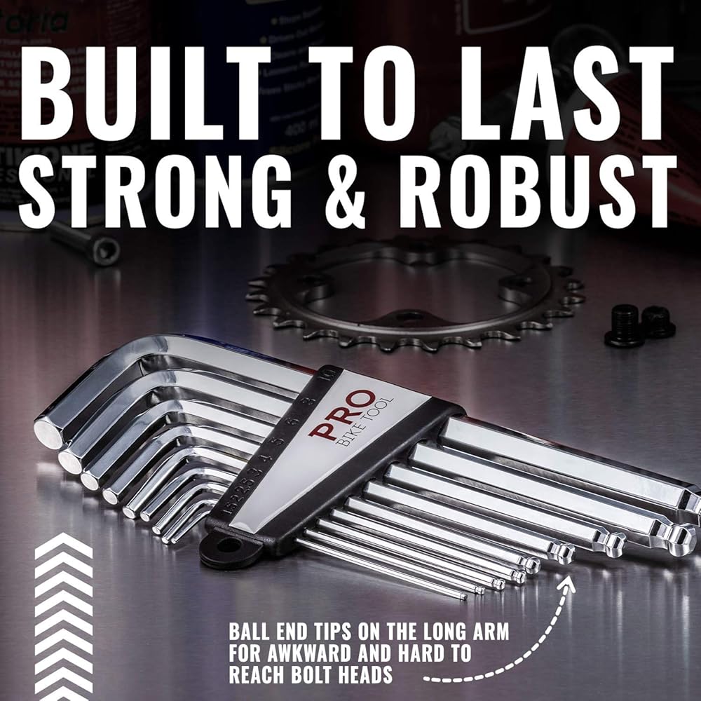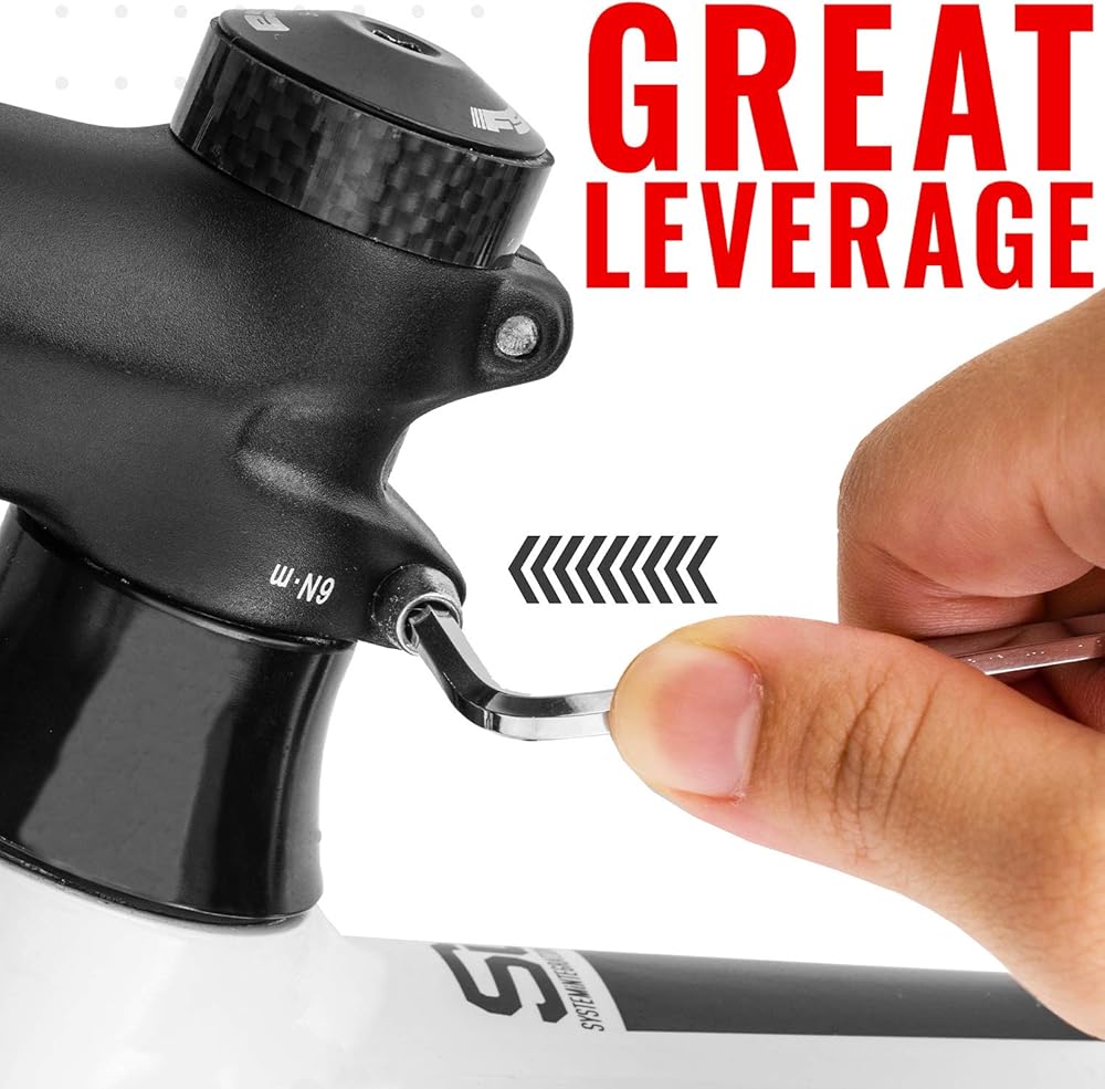أداة رائعة متعددة الاستخدامات للدراجة - مفاتيح سداسية طويلة ذات جودة عالية على شكل حرف L تحتوي على أطراف كروية على الذراع الطويل من أجل رؤوس مسامير محرجة ويصعب الوصول إليها وطرف قصير لتطبيقات عزم الدوران العالي.